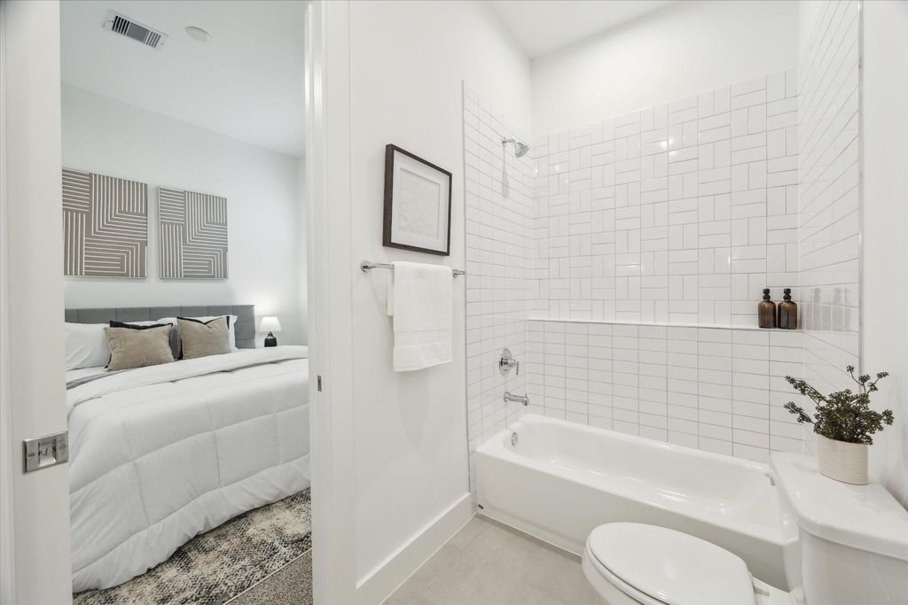 Introducing ELKHART GROVE by PREBISCH HOMES! An exquisite collection of 4 freestanding homes in a gated community with NO HOA! These meticulously designed homes offer 3 bedrooms, 2.5 bathrooms, and are thoughtfully crafted with seamless flow, clean lines, abundant natural light, small gardens, blinds throughout and the peace of mind of a builder warranty. The first floor offers two bedrooms, a full bathroom, and a bench area for backpacks, coats and storage. The kitchen is a true standout, featuring stainless steel appliances, a farmhouse sink, two toned cabinetry, quartz countertops, and floating shelves. Upstairs, experience the grandeur of the open-concept living/dining/kitchen space with soaring 16-foot vaulted ceilings and beautiful LVP floors. The luxurious primary suite includes an en-suite bathroom with a walk-in shower, double vanities, a transom window, and a spacious walk-in closet. Conveniently located near I-45 & 610 & just 12 minutes from Whole Foods, Aldi, and HEB!