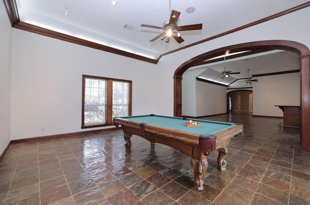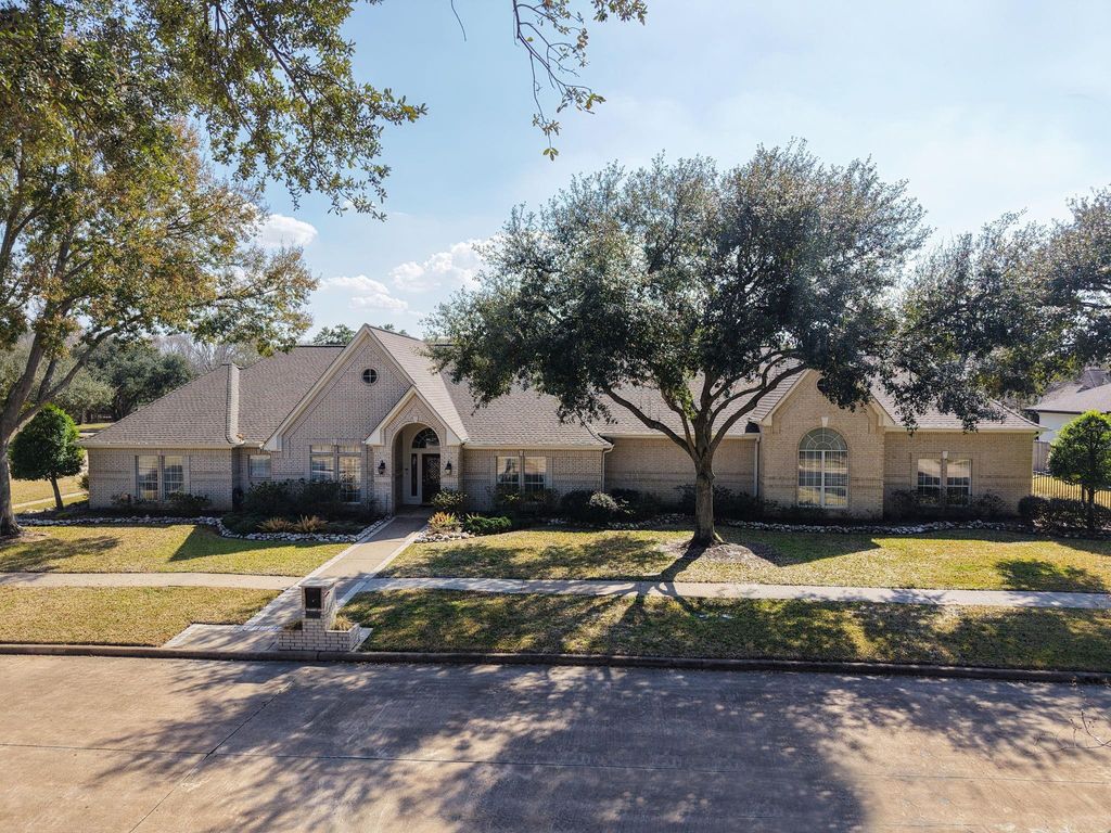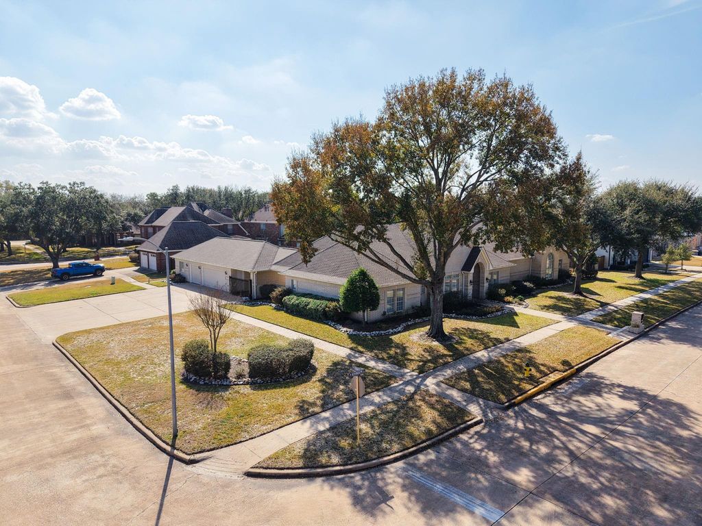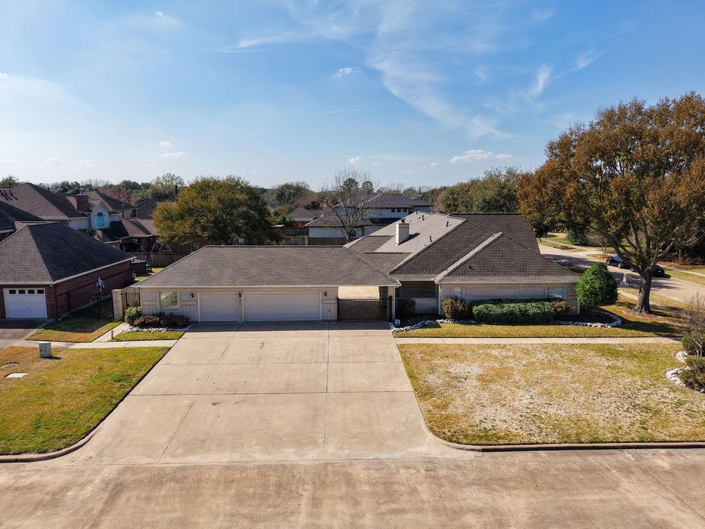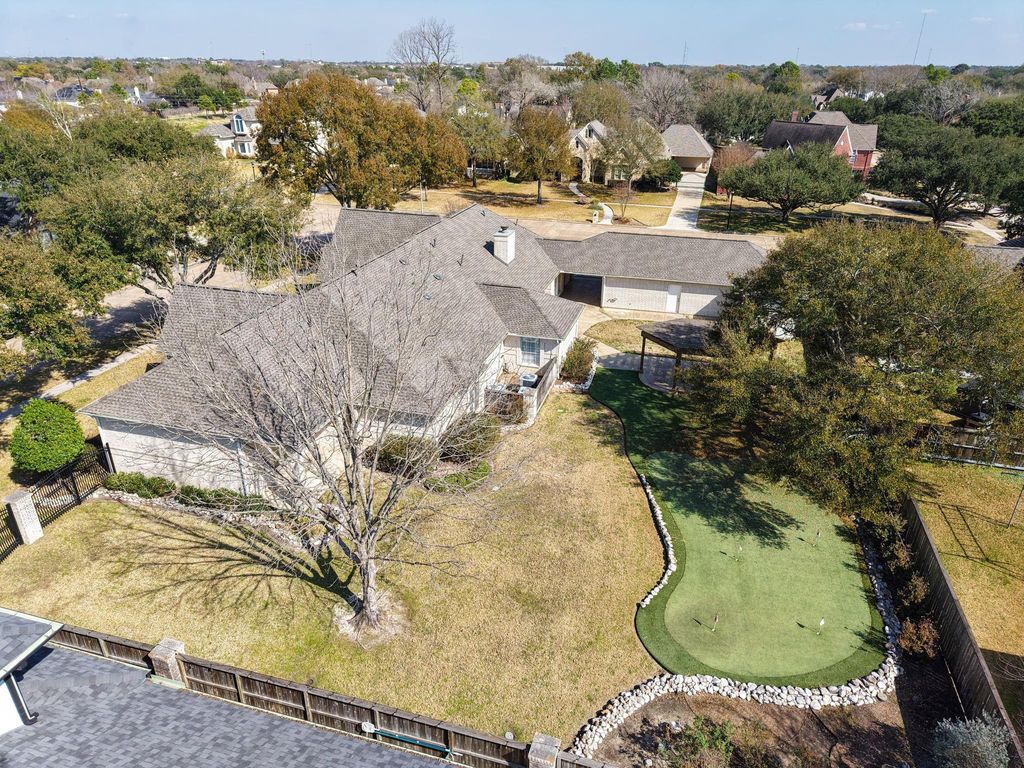 Beautiful, spacious house on an expansive corner lot of .52 +/- acres with fabulous curb appeal. This inviting residence showcases detailed woodwork throughout and offers formal living and dining area, plus a large family room complete with a fireplace and lighted built-ins, open to the kitchen and breakfast area. The kitchen features stainless steel appliances, a breakfast bar, and abundant cabinetry. The primary suite includes a step-up entry, a sitting area, and a oversized walk-in closet with built-ins. A second primary bedroom provides flexibility for guests or multigenerational living. Perfect for entertaining, the large game room includes a wet bar & ample space for gatherings. Additional highlights include a convenient potting/garden station with a sink located off the garage, a fenced backyard with a fabulous putting green for golf enthusiasts, and a generator for added peace of mind. A wonderful blend of space, comfort, and thoughtful details inside and out.