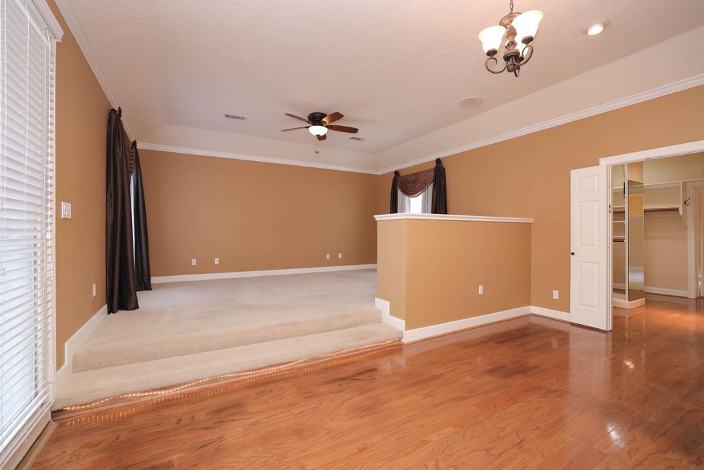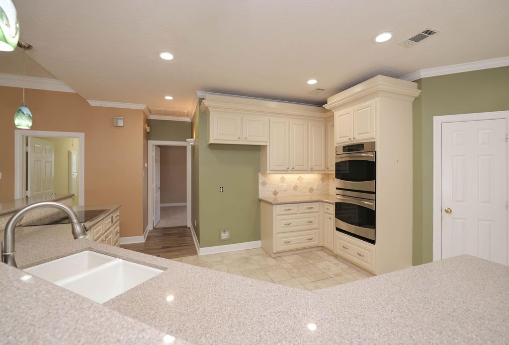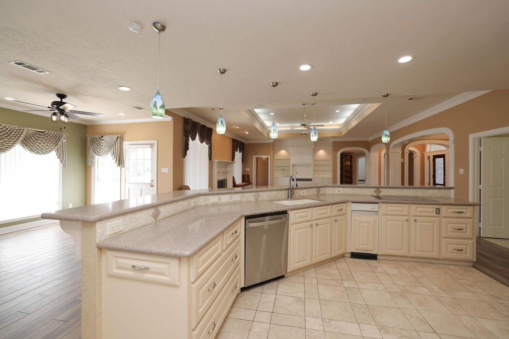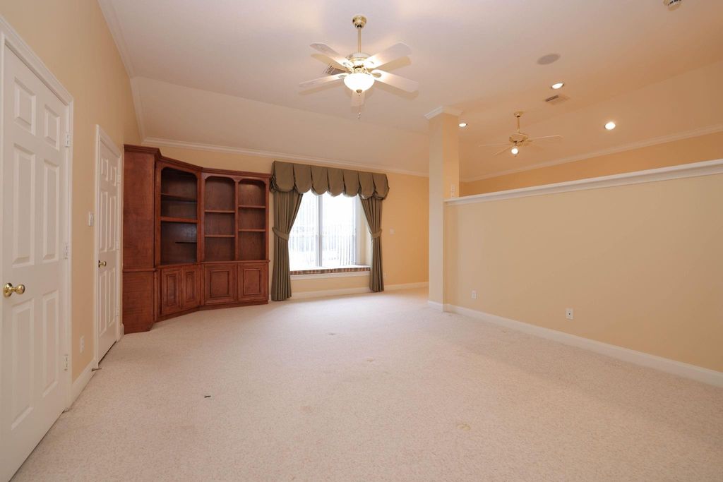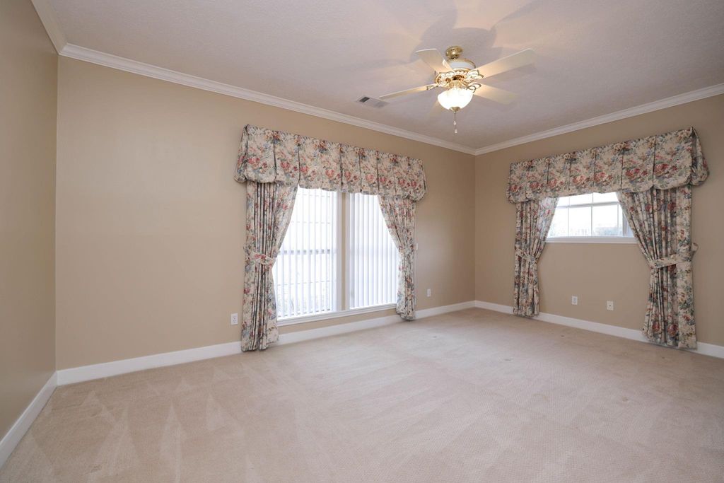 Beautiful, spacious house on an expansive corner lot of .52 +/- acres with fabulous curb appeal. This inviting residence showcases detailed woodwork throughout and offers formal living and dining area, plus a large family room complete with a fireplace and lighted built-ins, open to the kitchen and breakfast area. The kitchen features stainless steel appliances, a breakfast bar, and abundant cabinetry. The primary suite includes a step-up entry, a sitting area, and a oversized walk-in closet with built-ins. A second primary bedroom provides flexibility for guests or multigenerational living. Perfect for entertaining, the large game room includes a wet bar & ample space for gatherings. Additional highlights include a convenient potting/garden station with a sink located off the garage, a fenced backyard with a fabulous putting green for golf enthusiasts, and a generator for added peace of mind. A wonderful blend of space, comfort, and thoughtful details inside and out.