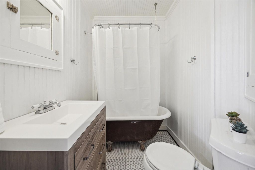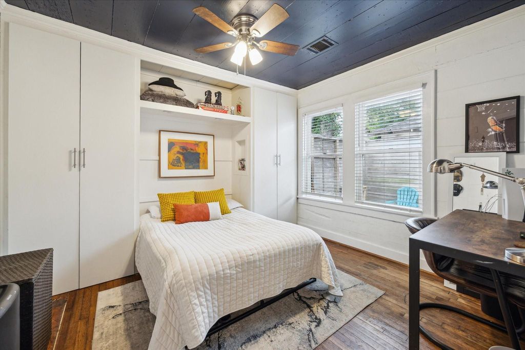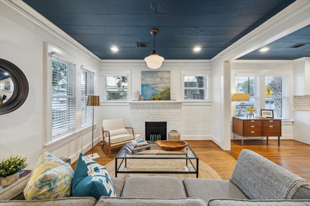Beautifully Updated 1920s Heights Bungalow, Zoned to Harvard Elementary, Blends Timeless Charm With Modern Living! From the glass doorknobs and pocket doors to the clawfoot tub, period details shine alongside thoughtful upgrades. Inside, enjoy hardwood floors, bold navy ceilings, shiplap walls, period-style lighting, and a classic brick fireplace. The updated kitchen features quartz counters, subway tile backsplash, sleek stainless appliances, including a wine fridge. The serene primary suite offers a shiplap ceiling, accent wall, walk-in closet, and spa-inspired ensuite with dual-sink vanity, linen storage, and walk-in shower. A flexible second bedroom with built-ins and nearby full bath and walk-in closet makes a perfect guest room, office, or home gym. Enjoy the covered front porch, white picket fence, and towering trees. Enjoy one of the most incredible, WALKABLE, locations in the entire city, steps away from the Hike & Bike Path, Stude Park, and the BEST local Hot Spots around!