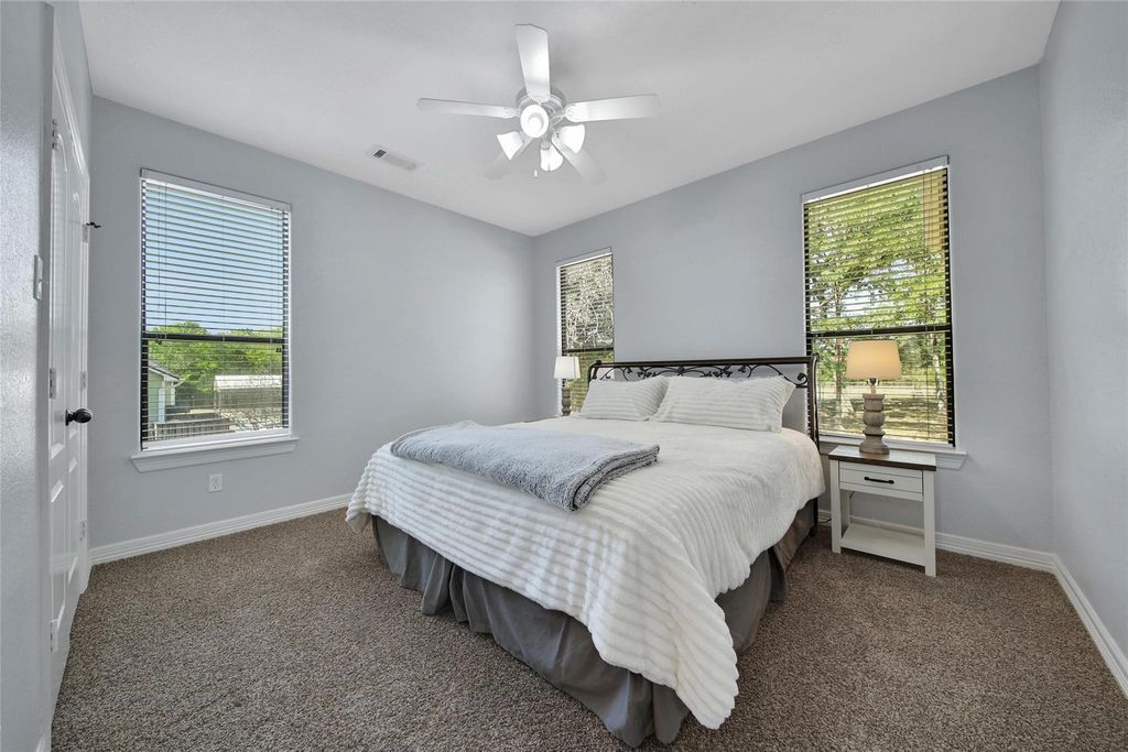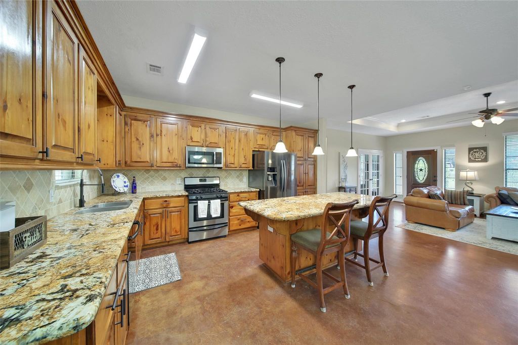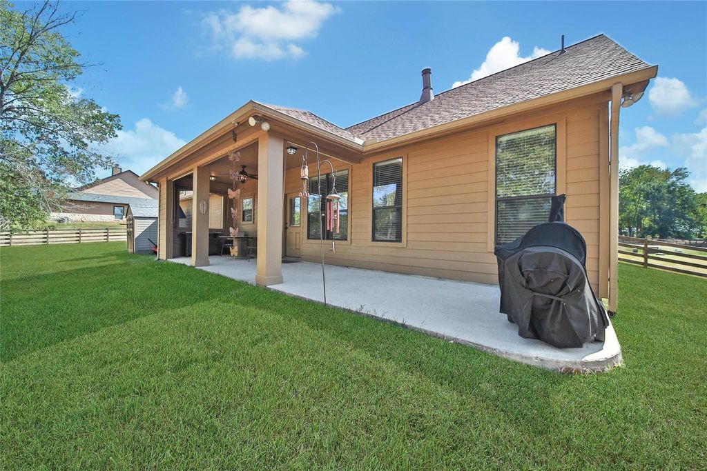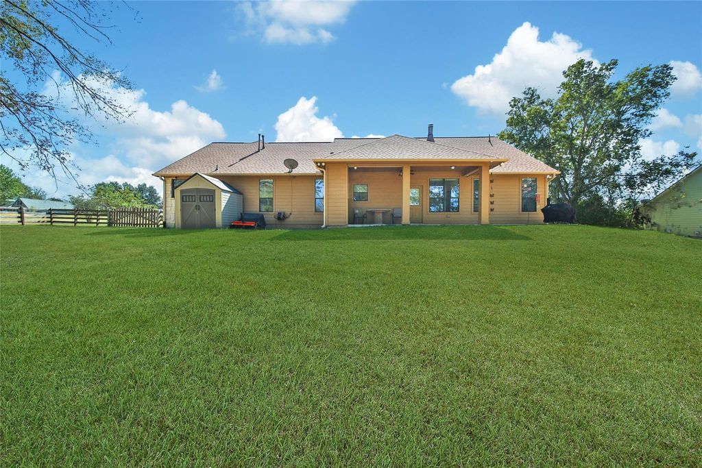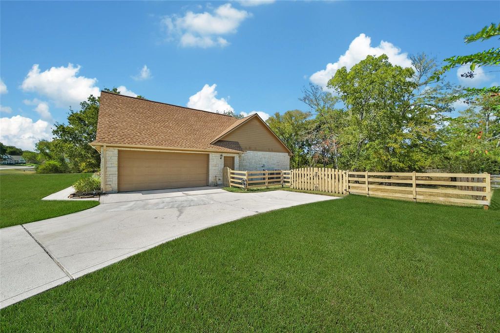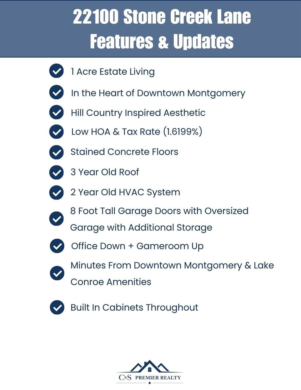 Welcome to the heart of Montgomery, Texas! This stunning White Austin Stone, 1.5-story home has been meticulously maintained. Featuring 3 spacious bedrooms, a dedicated office, and a large game room upstairs, this home offers plenty of room for work, play, and relaxation. The open-concept living, dining, and kitchen areas make entertaining effortless, while the stunning gas fireplace adds warmth and ambiance. The interior showcases beautiful stained concrete floors, two primary closets with built in cabinetry, and a split floor plan for added privacy. Step outside to enjoy morning coffee on the front porch or unwind on your expansive one-acre lot surrounded by a charming split-rail fence. Located in a quiet one-street neighborhood, this home also offers a low tax rate and low HOA dues. Big Ticket Items : Roof Replaced in 2022, HVAC Replaced in 2023! Don't miss this rare opportunity to own a beautiful piece of Montgomery "” where space, style, and serenity come together perfectly!