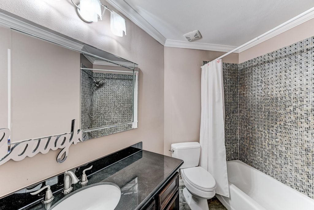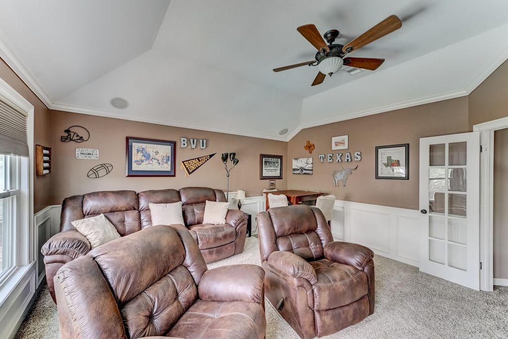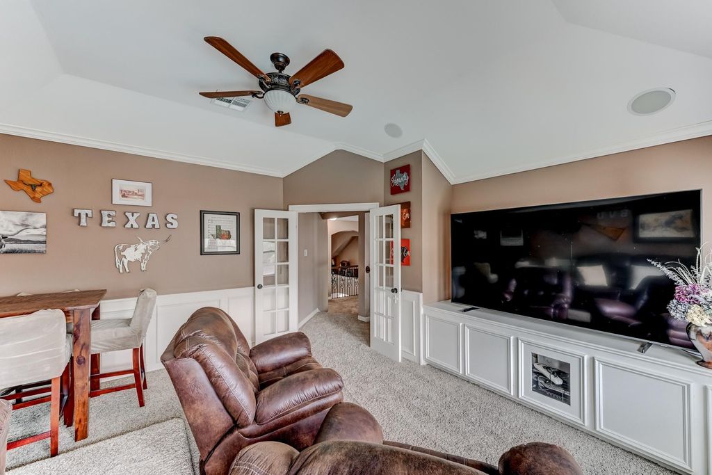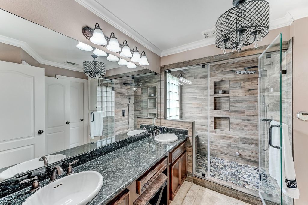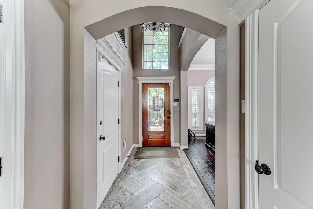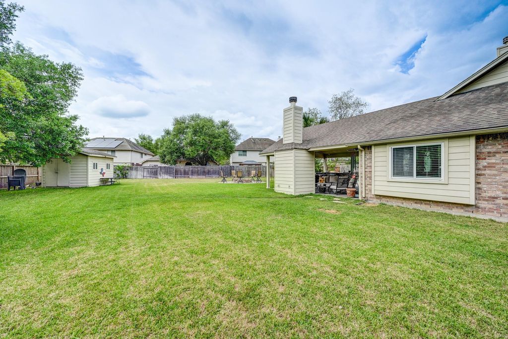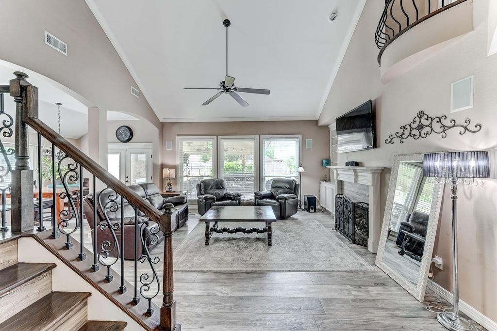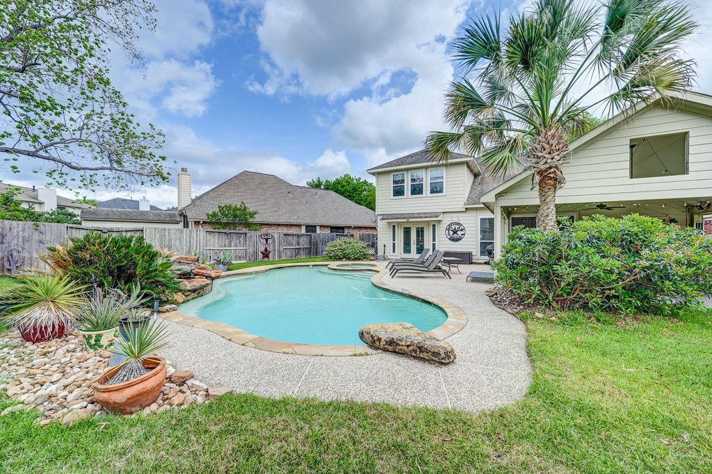 Stunning two-story Copper Lakes home offering the perfect blend of luxury, comfort, and entertainment! This spacious 4-bedroom, 2.5-bath home features a study or formal dining and a media/game room. Step into a dramatic living area with soaring ceilings, an indoor balcony, gas fireplace, and walls of windows that flood the space with natural light. The open kitchen is designed to impress with granite countertops, tile backsplash, abundant cabinetry, and generous prep space, with granite continuing throughout all bathrooms. The primary suite is a true retreat with tranquil pool views, private backyard access, and a spa-inspired ensuite featuring dual sinks and a steam shower. Outside, enjoy your own tropical oasis with a covered patio, outdoor kitchen, fireplace, pool, spa, and fire pit. Ideally located near Lone Star College and Towne Lake Boardwalk.