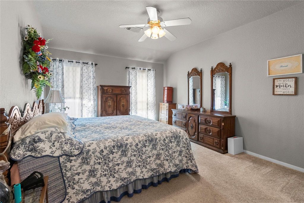 Charming and Comfortable, Loaded with Upgrades! Great location at end of cul-de-sac near park/walking trails, open concept, trendy colors throughout, popular floorplan, lots of space for storage, over $45k in extras including 2024 new American Standard 4 ton HVAC and new blown insulation, new carpets, new LG dw/stove/microwave/refrigerator, disposal replaced. Cherrywood cabinets with granite countertop in kitchen plus under cabinet lighting. Windows replaced with double pane, full gutters on exterior, fencing replaced, patio upgraded. Features full solar panel system at $129/mo. seller says cuts utilities in half or more! Enjoy the peaceful country lifestyle in one of Santa Fe's popular communities, relax on the front porch in the evening and entertain in the back yard all year. Ready for move-in, this is a must see today!
