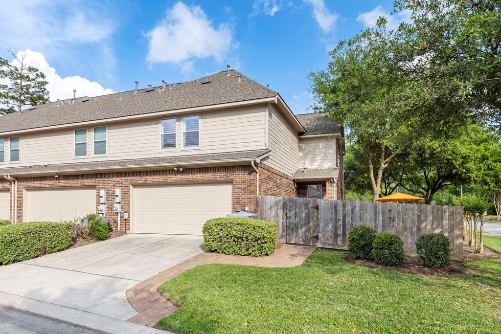 Wonderful townhome in The Woodlands with 3 bedrooms plus game room. Roof replaced in 2023, exterior paint 2024, reasonable HOA fees include Inc landscape, exterior maintenance plus 1000 Mbps internet and outside of building insurance. Primary bedroom and game room have engineered hardwood floors and custom plantation shutters. stairway, upper hallway and 4th bedroom all re-carpeted. Primary and guest bath cabinets were refinished with new custom doors, sinks, faucets and quartz counters added. Primary shower retiled with new frameless glass door. Kitchen has new Silestone quartz counters with Grohe sink faucet. Carrier 4-ton 17 seer Ac 2021, Tankless Rinai water heater 2023. End unit with privacy side yard.