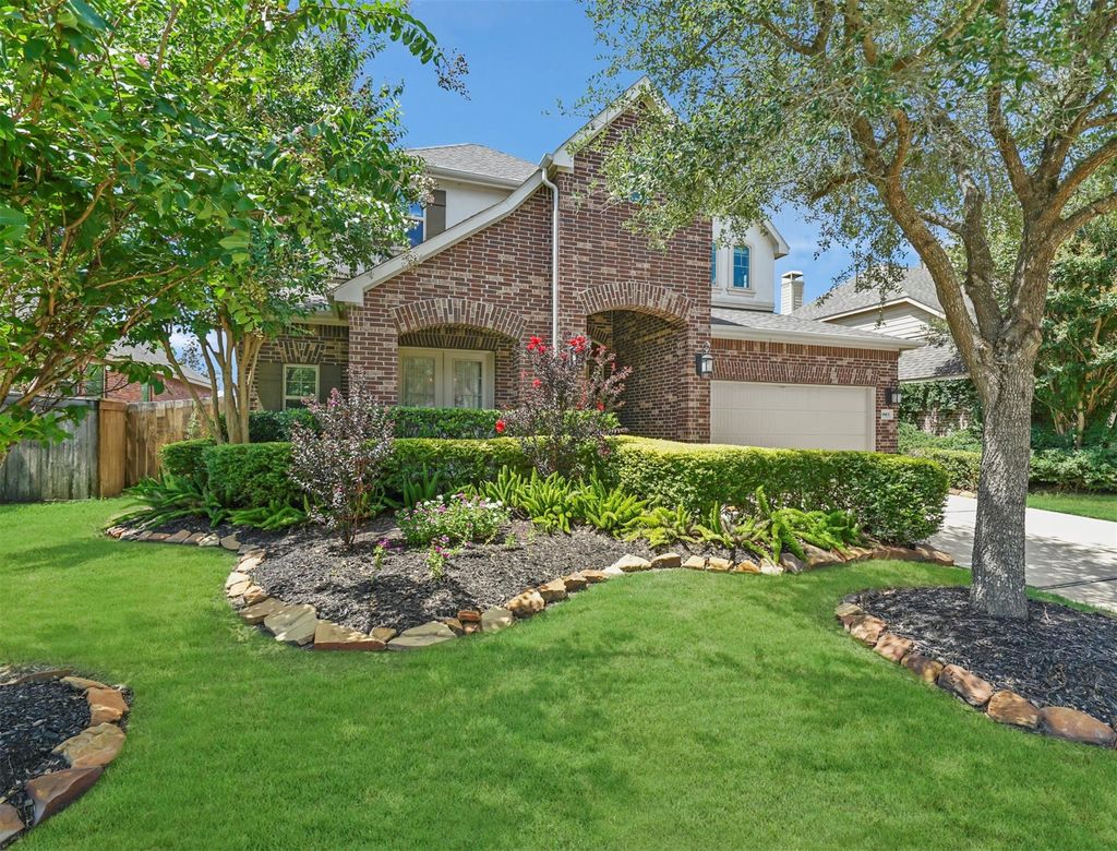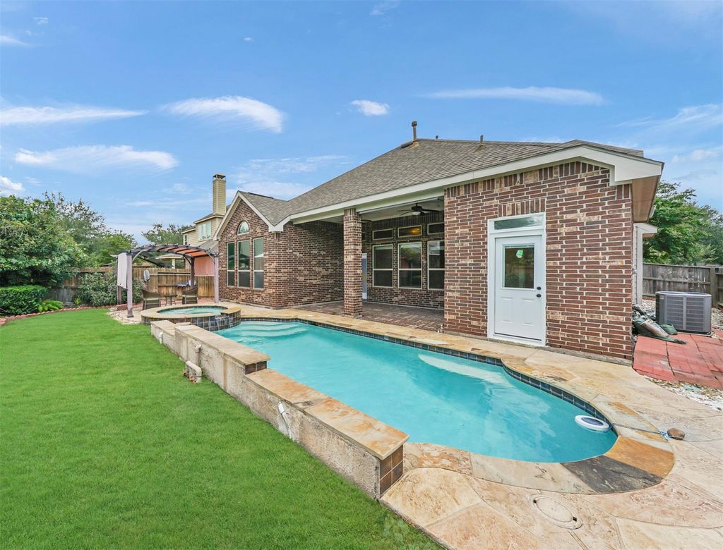 Experience refined living in this stunning 5-bedroom brick and stucco residence, perfectly situated on a quiet cul-de-sac in the heart of Cinco Ranch. The grand foyer features soaring ceilings and an immediate sightline to the backyard oasis. An open-concept great room boasts intricate tray ceiling details and a gas log fireplace, flowing into a chef's kitchen equipped with granite countertops, a central island, and a built-in gas range. The main floor offers a secluded primary suite with vaulted ceilings and a spa-like bath, plus a secondary guest bedroom with a private full bath, ideal for a home office or multi-generational needs. Upstairs, a versatile loft leads to three spacious bedrooms and two additional full baths. The exterior is a true retreat, featuring a fully covered patio with dual fans, a designer pool, and a shaded timber pergola. Enjoy direct access to neighborhood walking trails, parks, and award-winning amenities. Schedule your private tour today!