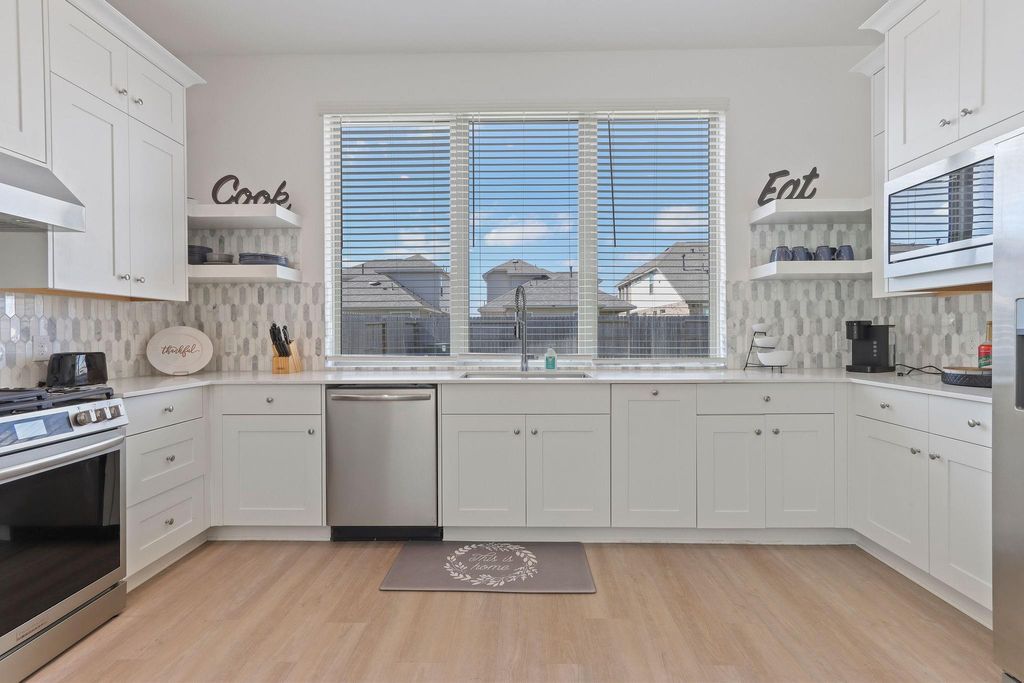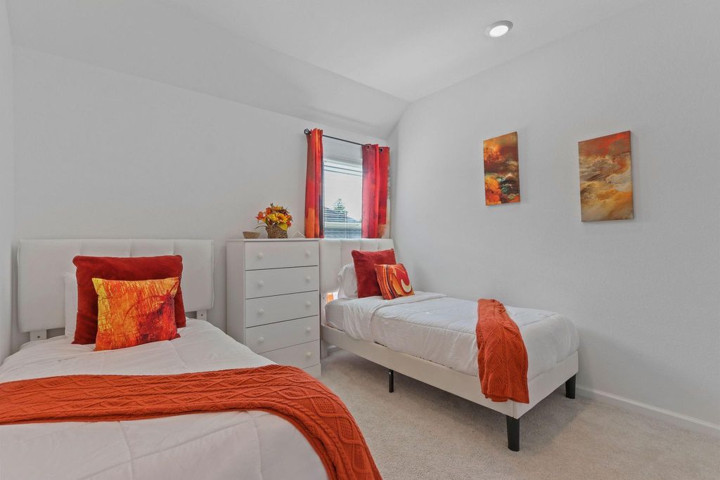 This well-designed two-story home offers a functional layout with comfortable living spaces throughout. The first floor features an open-concept design that seamlessly connects the living area, dining space, and modern kitchen, creating an ideal setting for everyday living and entertaining. The kitchen overlooks the family room and provides easy access to the covered patio, extending the living space outdoors. Upstairs, the home offers four bedrooms, including a private owner's suite positioned in a quiet corner of the home. The owner's suite includes an en-suite bathroom and a walk-in closet for added convenience. Three secondary bedrooms are located down the hall and share a full bathroom, offering flexible space for family, guests, or a home office. The thoughtful layout provides both privacy and practicality in a comfortable two-story design.