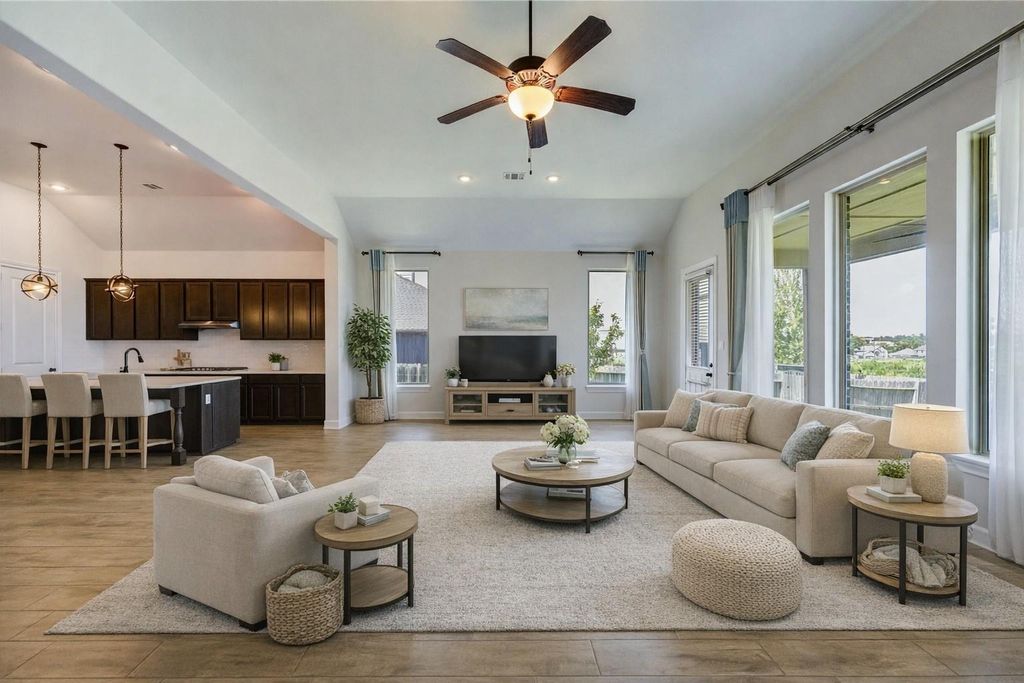 Beautiful Energy Star Certified One-Story Home in the Heart of Montgomery! Welcome to this light-filled 4-bedroom, 3-bath home offering modern comfort and timeless charm. Featuring high ceilings and large windows throughout, every room feels open, airy, and inviting. The spacious primary suite includes a luxurious bath and walk-in closet. Separate shower. 3 additional bedrooms provide plenty of space for family or guests. A private study offers the perfect spot for a home office, while the formal dining room is ideal for gatherings. The chef's kitchen boasts a large granite island, KitchenAid stainless-steel appliances, and ample storage"”designed for both everyday living and entertaining. Enjoy outdoor living under the covered back patio overlooking a huge backyard"”perfect for BBQs or relaxing evenings. The home's brick-and-stone exterior adds great curb appeal. Located in a golf-cart-friendly community in Historic Montgomery, Minutes from shops and restaurants. Low HOA.