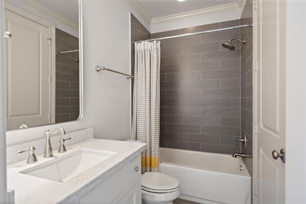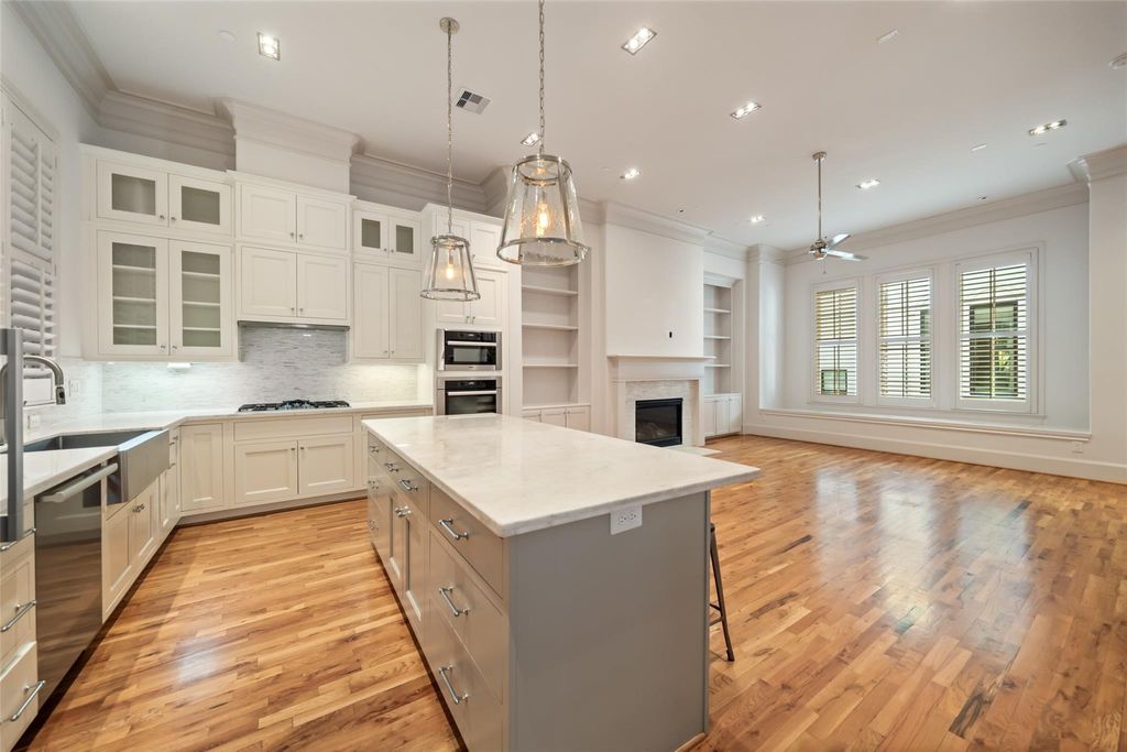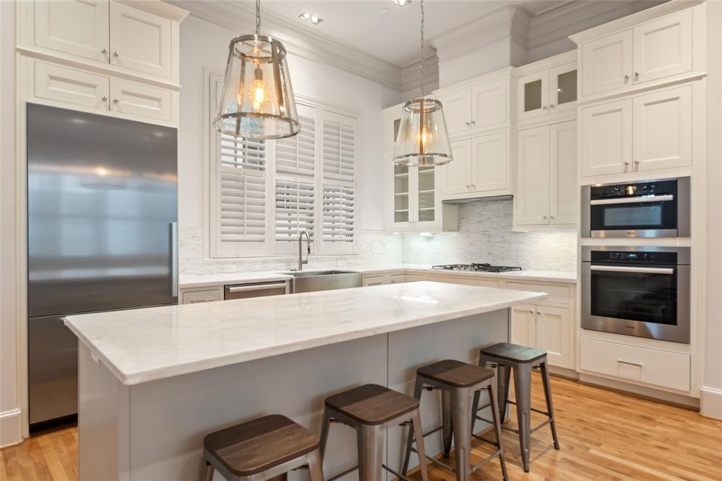 Situated in an exclusive gated community in Montrose, this luxurious home features 12 ft. ceilings, a gas fireplace, and modern built-in bookcases. The chef's kitchen boasts high-end Miele appliances, a spacious island, double stacked cabinets, and marble countertops. Hardwood floors, custom shutters, and ample natural light throughout. 4th-floor game room leads to a rooftop terrace with stunning views. Elevator access to all floors, primary bedroom with en-suite spa-like bath, huge walk-in closet, and zoned HVAC complete this home. Washer/Dryer and Refrigerator convey. Close to Downtown Houston, Galleria, and Medical Center, offering a lock and leave lifestyle. Truly a remarkable and rare find that includes ELEVATOR, Miele Refrigerator, Washer/Dryer and Custom Shutters. Amazing well maintained home with ELEVATOR!