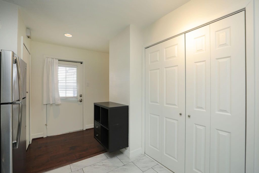 Welcome to The Park Regency gated, controlled access condo living with a community pool and beautifully maintained grounds. This two bedroom, one bath home features rich wood floors and a bright, open layout. The spacious living area showcases, a striking stacked-stone fireplace, and modern ceiling, fans, plus a wall of sliding glass doors that open to a private balcony with treetop views. The updated kitchen offers, abundant, cabinetry including glass front uppers, stainless appliances, a sleek tile backsplash, and generous counter space. It has a convenient in unit laundry with extra shelving. Washer, dryer and refrigerator are included. Enjoy the landscape courtyard, patio and relaxing pool. This is perfect for an easy lifestyle with shopping, dining and nightlife close by.