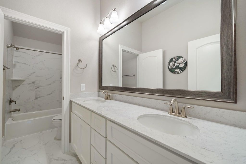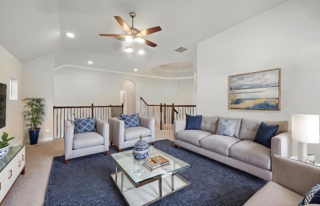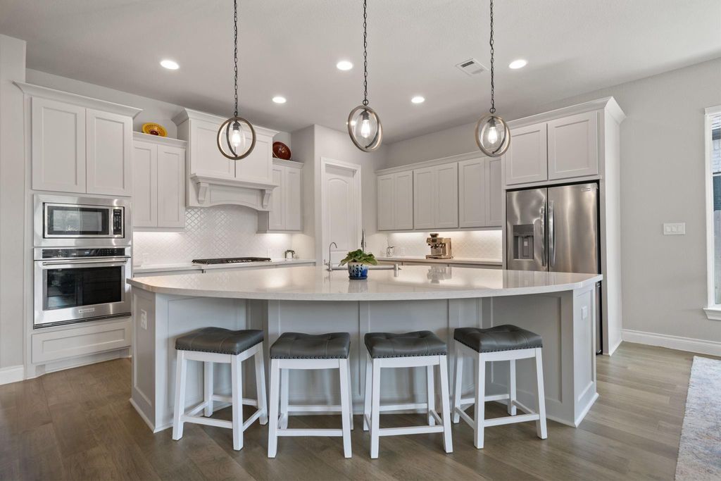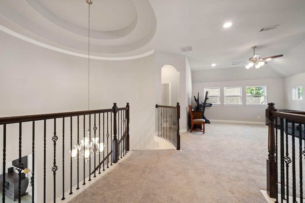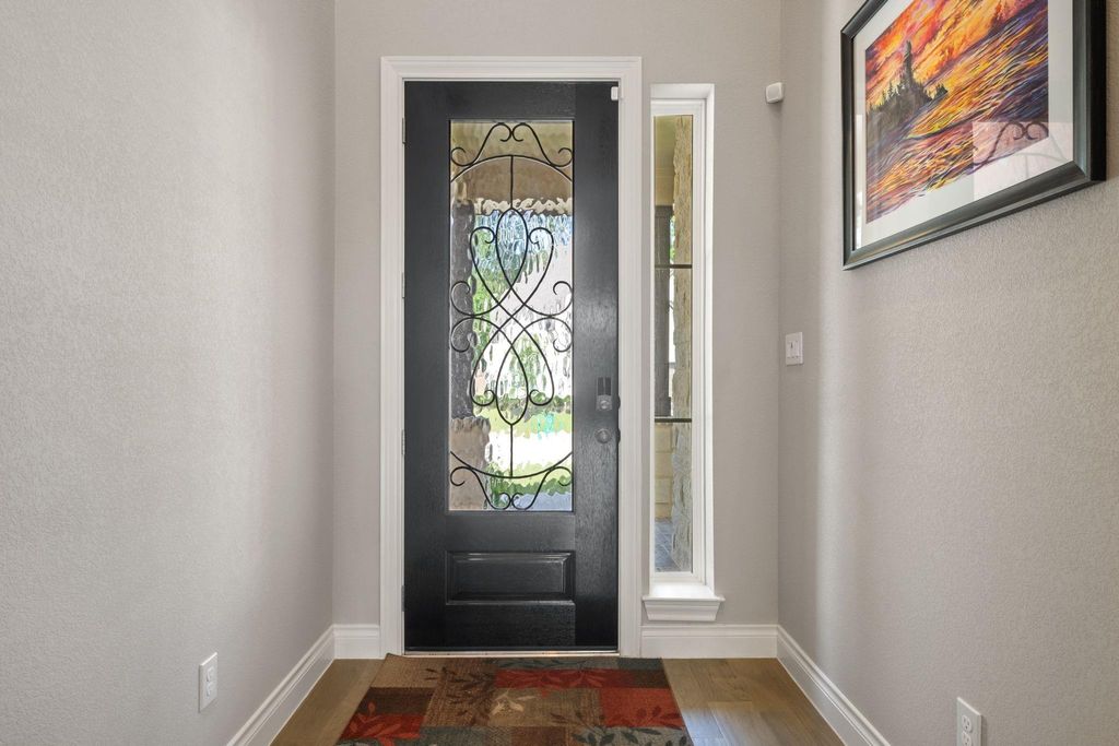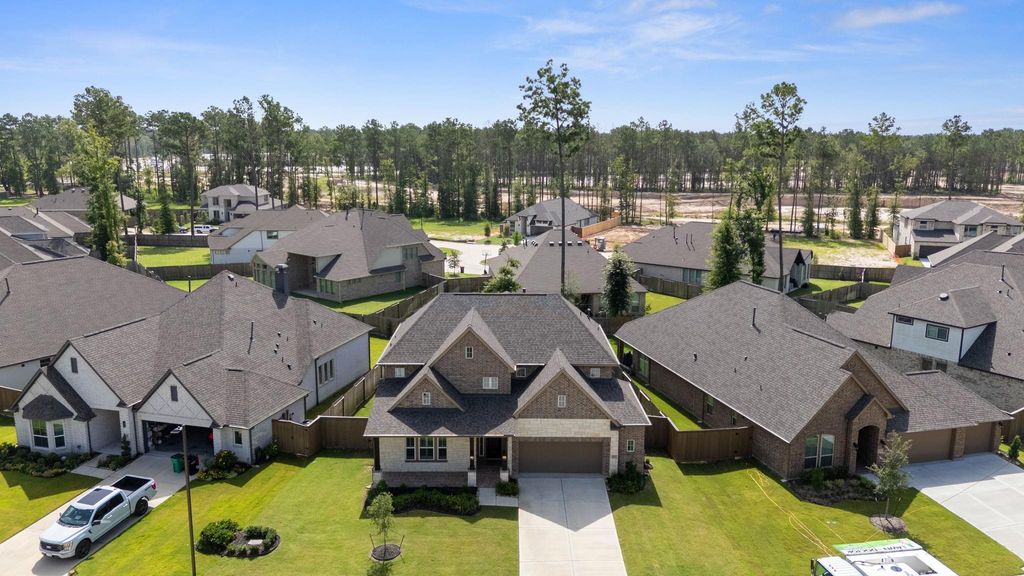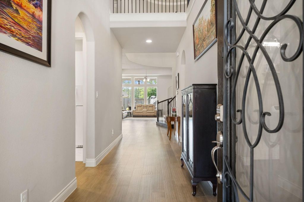 Step into this beautifully designed 2-story home, where a dramatic 21-foot entry and striking rotunda ceiling over the staircase create an unforgettable first impression. The open-concept kitchen is both stylish and functional, with upgraded can lighting, built-in stainless steel KitchenAid appliances, a Frigidaire refrigerator, and a curved island that flows seamlessly into the spacious family room. Rich RevWood flooring and custom shades throughout the main living area add warmth, durability, and everyday elegance. A light-filled front bedroom offers the perfect flexibility for a home office or guest space, while the private first-floor primary suite is tucked quietly at the back of the home for added comfort and convenience. Upstairs, you will find a generous game room, multiple secondary bedrooms, a full and secondary bathroom"”ideal for family, guests, or multi-generational living. Unwind outdoors under the covered patio and enjoy the comfort of your private backyard oasis.