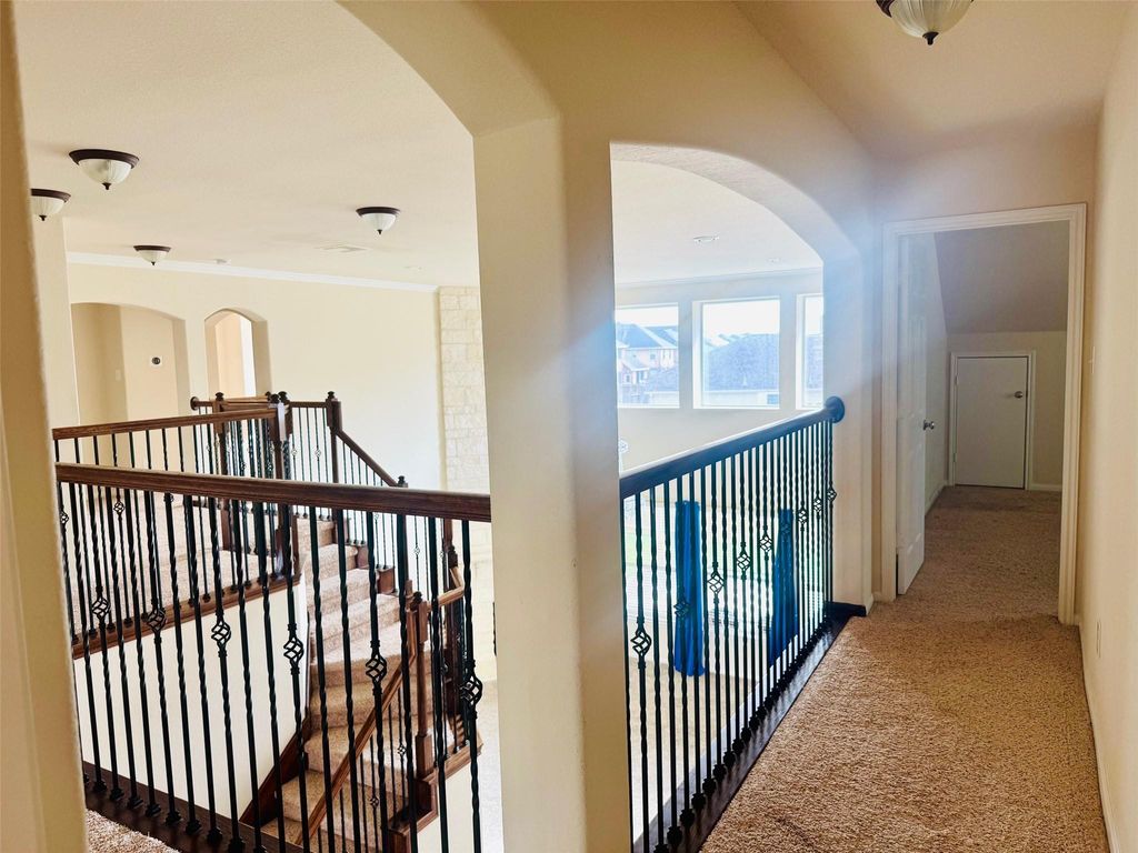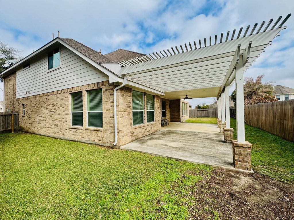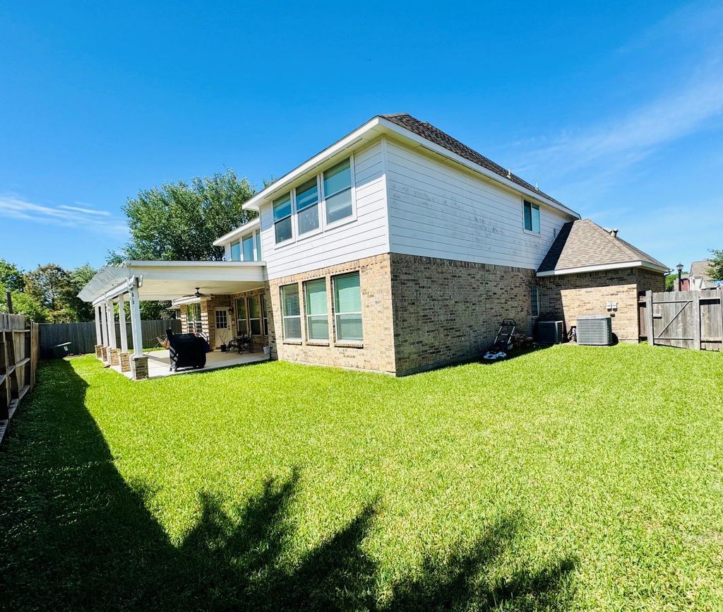 This stunning two-story home welcomes you with an elegant foyer, flanked by a formal dining room and a spacious living area perfect for entertaining. The gourmet kitchen features a breakfast bar and opens seamlessly to a bright breakfast nook. The inviting family room offers a cozy corner fireplace, creating the perfect space for relaxation. The first-floor primary suite includes a private bath with a garden tub, separate shower, and dual vanities for added comfort and convenience. Upstairs, a beautiful staircase leads to a large game room, along with four additional bedrooms and two full bathrooms ideal for families or flexible living space. A conveniently located powder room is situated downstairs near the spacious three-car garage. Upgrades include: stone exterior accents, glass front door, wrought iron stair parts, stone fireplace, 18" ceramic tile flooring (entry, kitchen, breakfast area, primary bath, utility room).