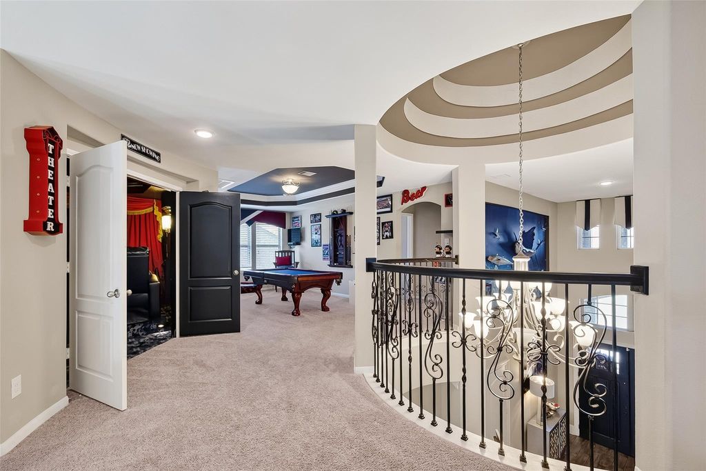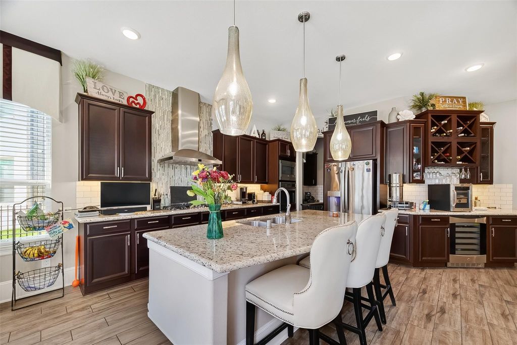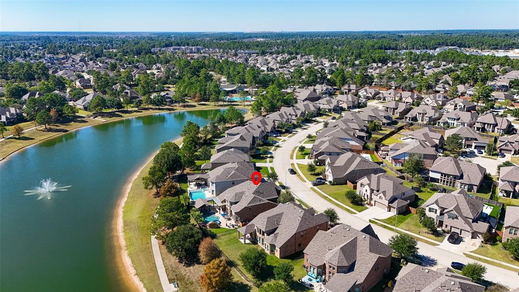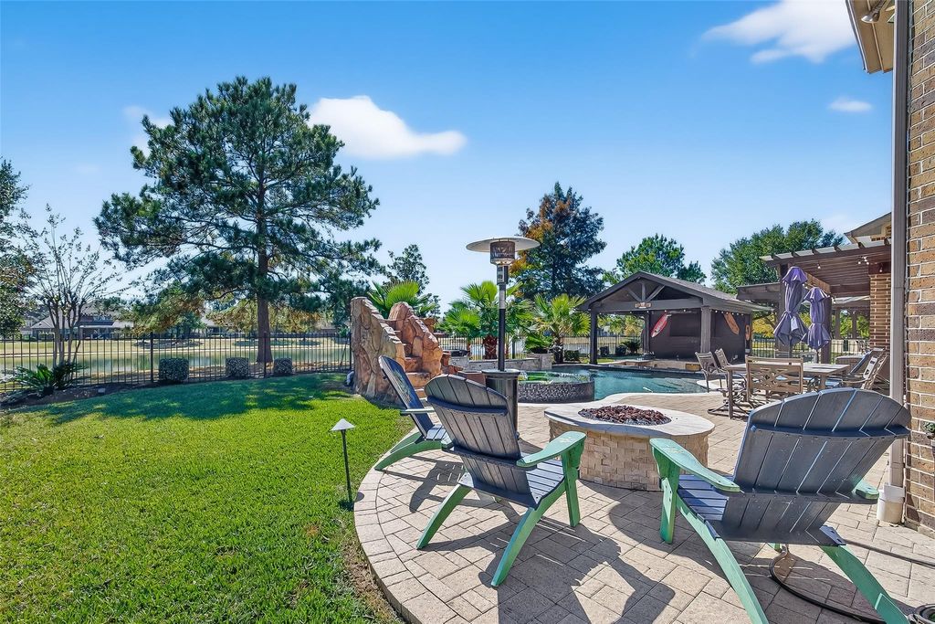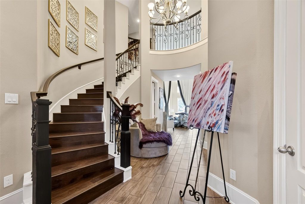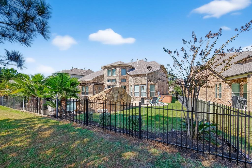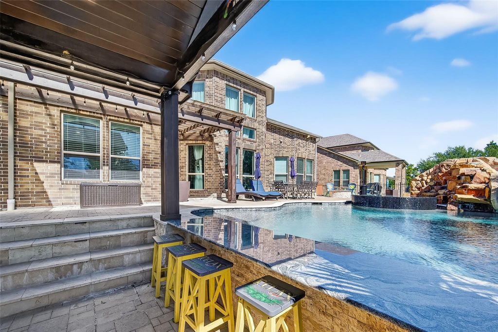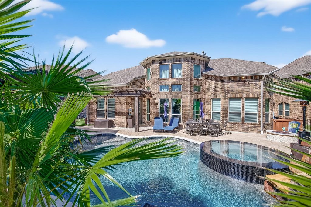 Located in the gated Peninsula at Waters Edge, this stunning home welcomes you with a grand rotunda entry and curved wrought iron staircase. The family room offers two-story ceilings and large windows that fill the space with natural light and provide beautiful views of the lake and walking trails. The chef's kitchen includes stainless steel appliances, generous storage, and ample workspace. Step outside to experience true indoor-outdoor living. The backyard is designed for entertaining, complete with a sparkling pool, outdoor bar, and a fully equipped outdoor kitchen with a built-in grill and generous counter space. The outdoor fireplace creates the perfect atmosphere for gatherings and relaxation year-round.