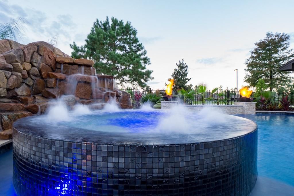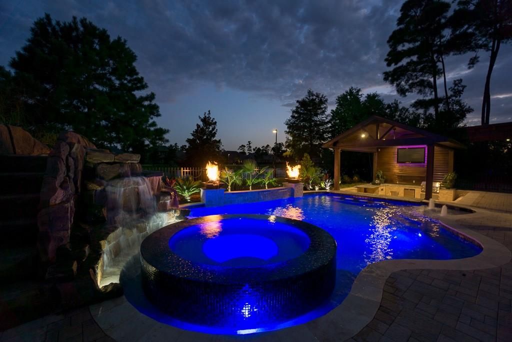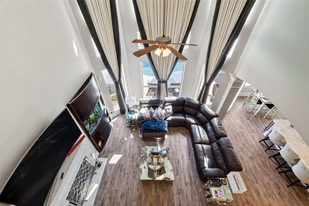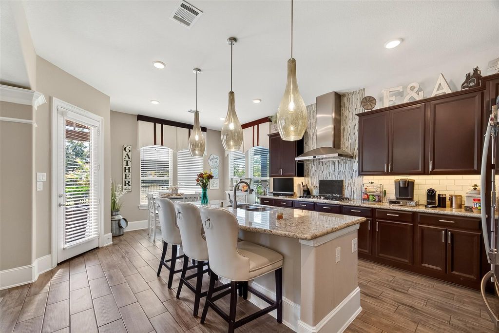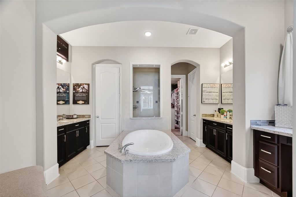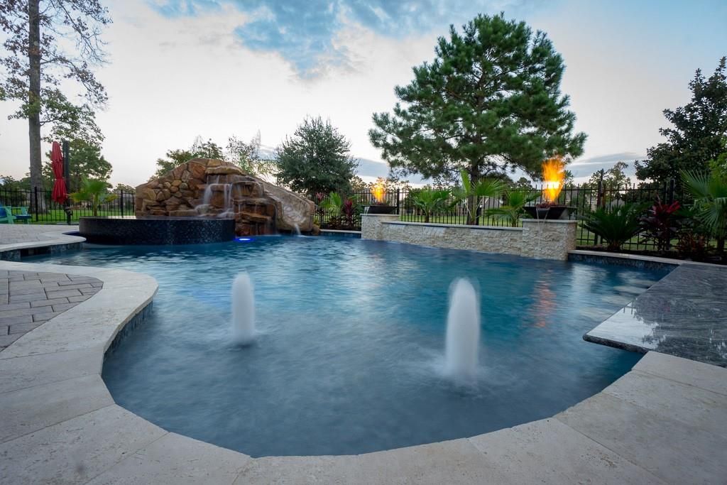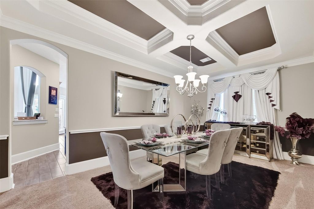 Located in the gated Peninsula at Waters Edge, this stunning home welcomes you with a grand rotunda entry and curved wrought iron staircase. The family room offers two-story ceilings and large windows that fill the space with natural light and provide beautiful views of the lake and walking trails. The chef's kitchen includes stainless steel appliances, generous storage, and ample workspace. Step outside to experience true indoor-outdoor living. The backyard is designed for entertaining, complete with a sparkling pool, outdoor bar, and a fully equipped outdoor kitchen with a built-in grill and generous counter space. The outdoor fireplace creates the perfect atmosphere for gatherings and relaxation year-round.