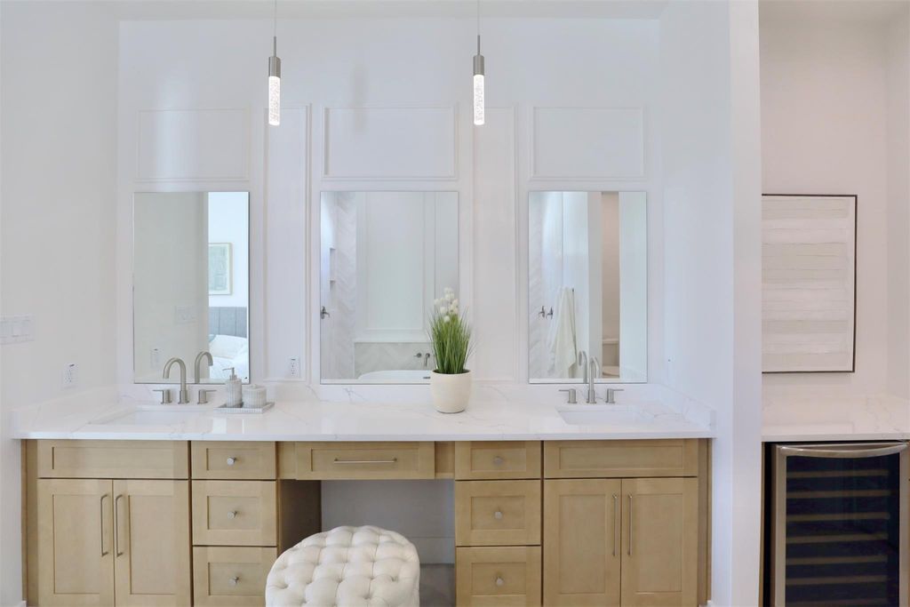 Pannu Homes presents a charming architectural home layered in warm whites with crisp accents. NO Flood Zone and enclosed by a 7-foot cedar fence with metal entry gates, driveway is prewired for a security camera. Inside, 10-foot ceilings, 8-foot accent-painted doors, and craftsmanship-style millwork enhance sunlit spaces with character. A beautifully designed fireplace adds depth and dimension, drawing you into the living room with an architectural layering design.The kitchen is designed to accommodate a chef with an elegant twist, featuring a 36" fireclay farmhouse sink paired with a stunning bridge faucet, convenient pot filler, designated spice rack, baker's storage cabinet, and a striking waterfall-edge island that is an aesthetic showpiece.Primary spa-inspired bath and generous closet space, while the expansive backyard invites gathering, entertaining, and everyday enjoyment.Every element is thoughtfully curated to enhance elevated living.Come visit the home is staged for you!