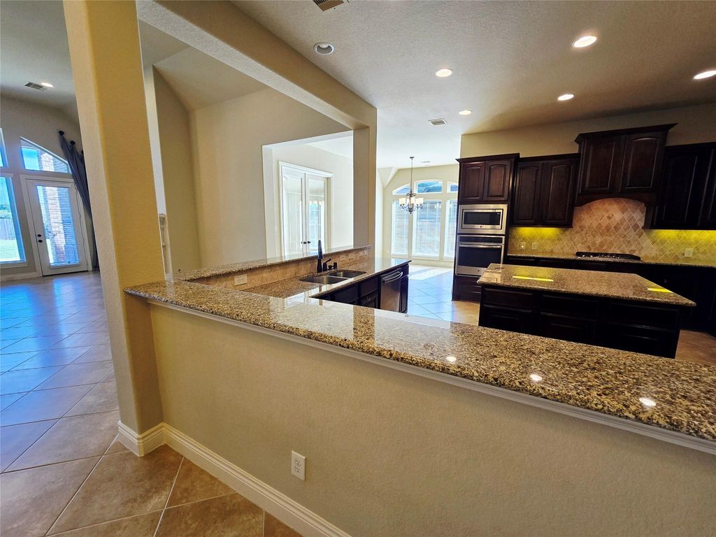 Huge One Story Home! Walk into the library with French doors and formal dining room, both with hardwood floors. frame entry with 13-foot coffered ceiling. Family room (Den) with 14 foot ceilings, cast stone fireplace, ceramic tile and floor to ceiling windows. Game room with French doors off the breakfast area. Island kitchen features granite countertops, 42-inch raised panel cabinets, large walk-in pantry. Spacious Owner's Suite with His and Her Closets. Guest suite with full bath and walk-in closet. Retreat out to the covered patio or enjoy the spacious backyard with no back neighbors. Call today for your private tour!