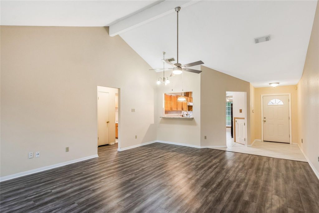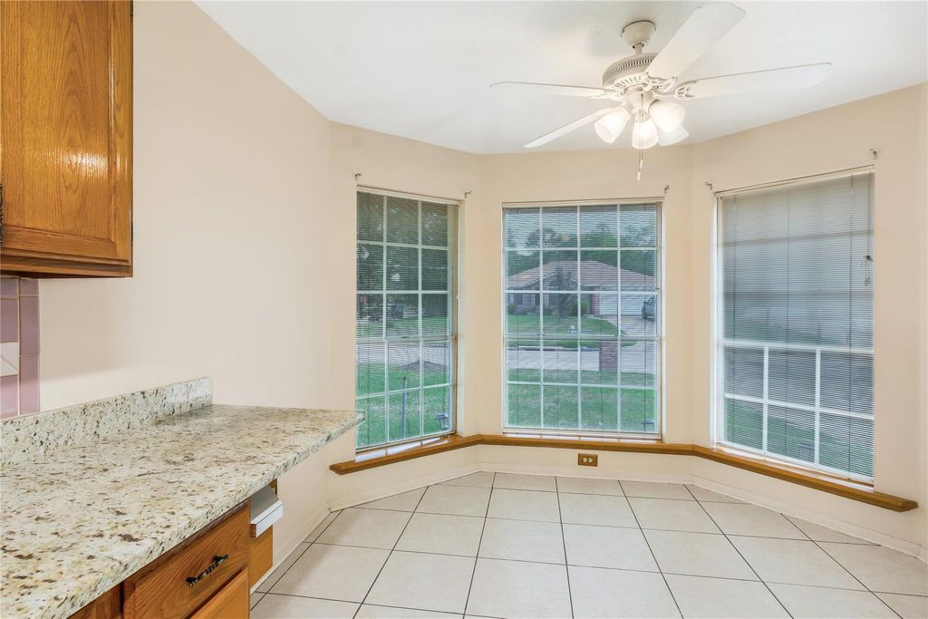 Situated on a spacious corner lot in Rolling Green, this 3-bed, 2-bath home features a family room with a wood-burning fireplace. Each bedroom boasts ceiling fans, with a fenced backyard and concrete patio perfect for outdoor entertaining. The kitchen includes a breakfast nook overlooking the street, and the garage offers storage cabinets and parking for 2 vehicles. Roof upgraded and installed two years ago and fencing installed last year. Additional natural light through glass outer front door. highlights include a washer, dryer, refrigerator, and a glass outer screen at the front for added natural light. Enjoy the neighborhood pool and park just a short stroll away.