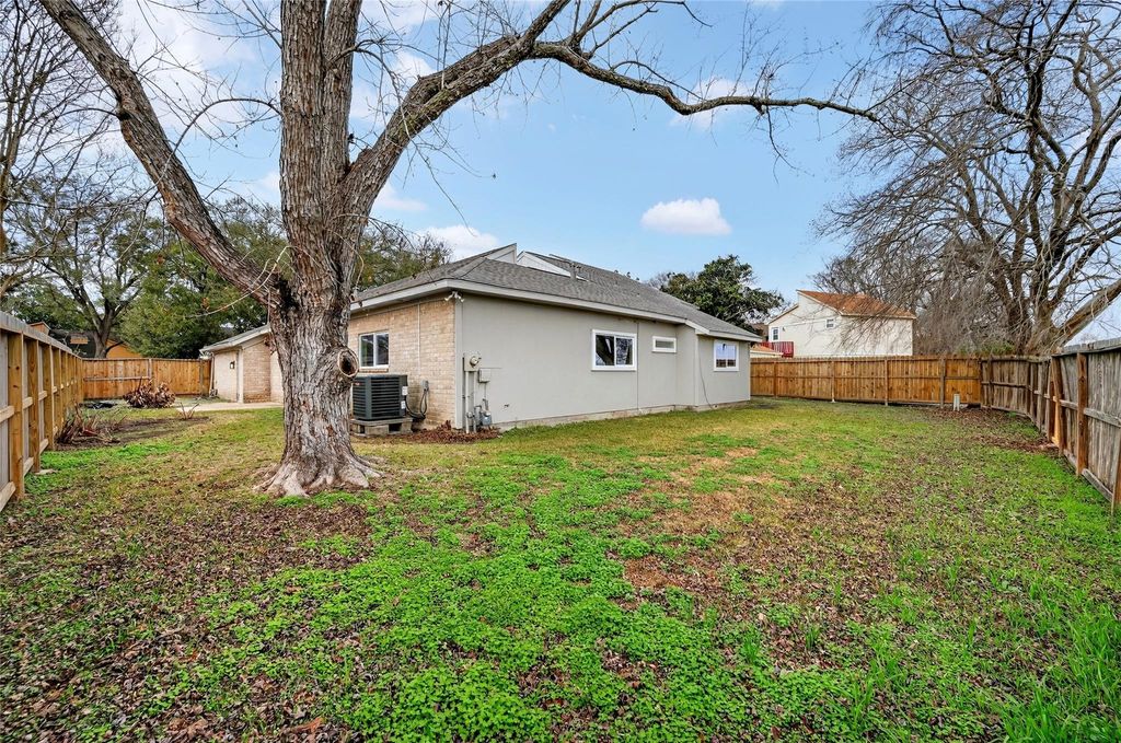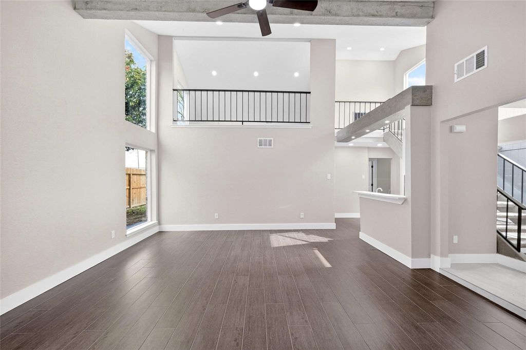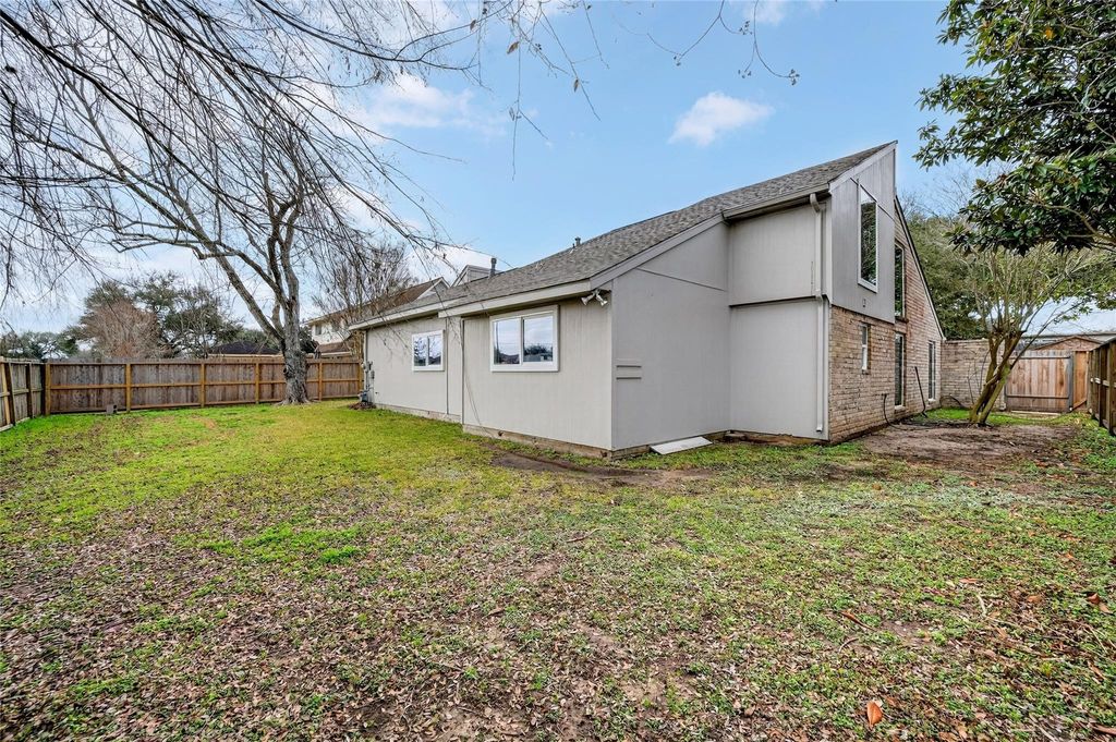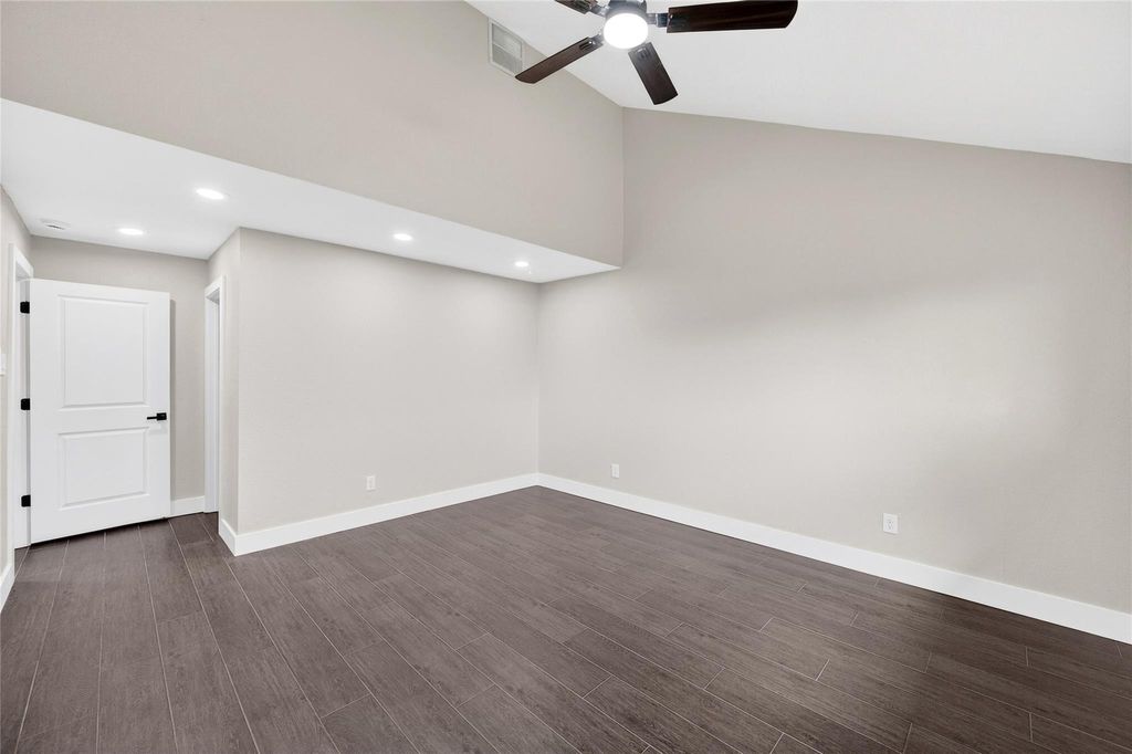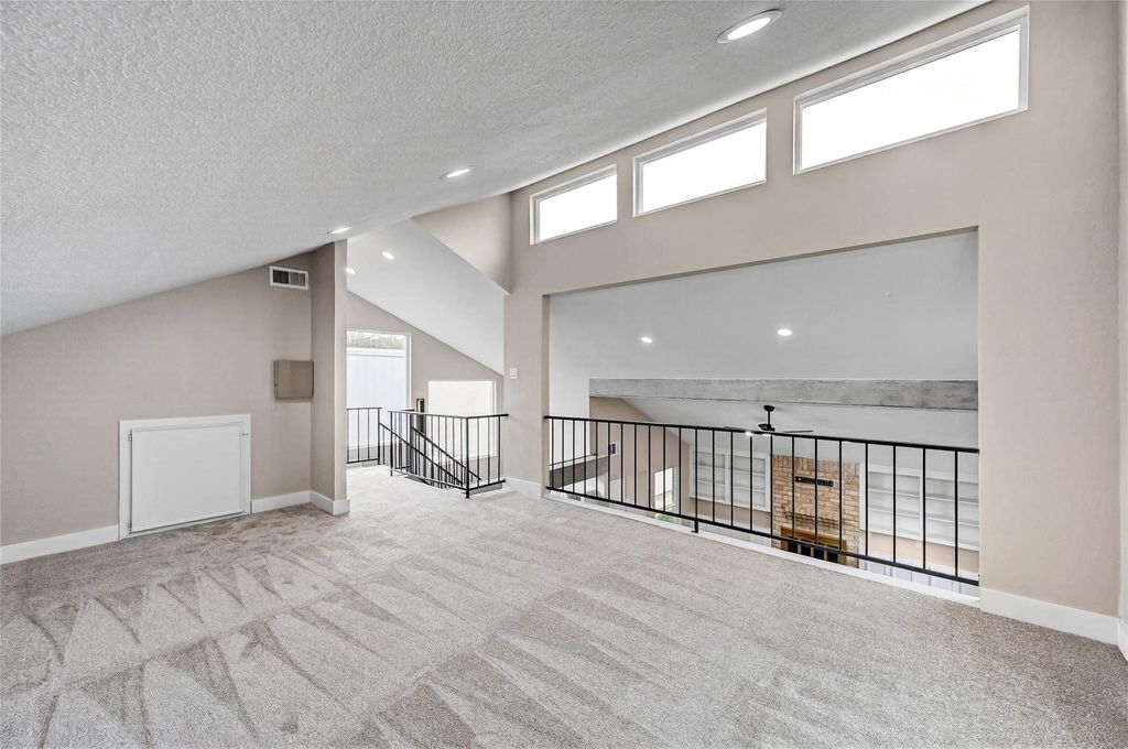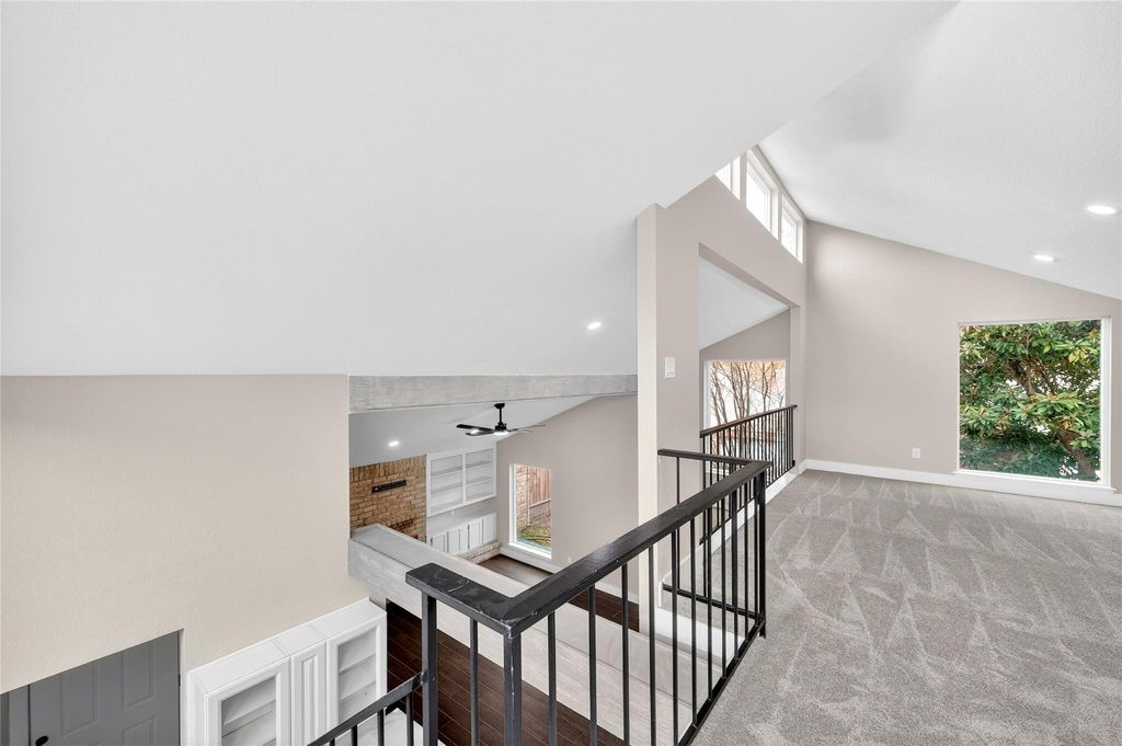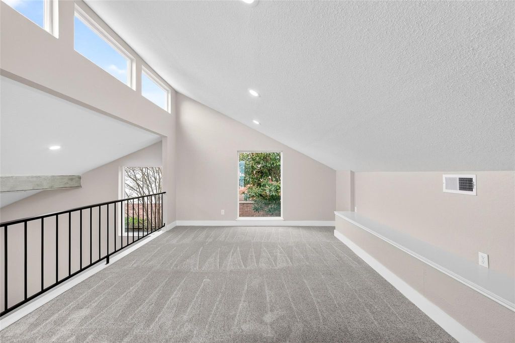 Recently updated 3-bedroom, 2-bath home offering 2,153 sq ft of thoughtfully designed living space on a 9,120 sq ft lot. Built on a slab foundation with brick veneer exterior, the home features vaulted and high ceilings, recessed lighting, ceiling fans, and expansive living areas filled with natural light. The central living room showcases an open-to-above ceiling and built-in wet bar, creating a defined entertaining space that flows seamlessly into the dining area and kitchen. The kitchen includes quartz countertops, gas range, and extensive cabinetry. The primary suite features a double quartz vanity, framed mirrors, matte black fixtures, and a glass-enclosed walk-in shower with tiled niche. Flooring throughout the main level and bedrooms is hard surface; the second-floor loft is carpeted, providing a flexible additional living area. A private interior patio anchors the center of the home.