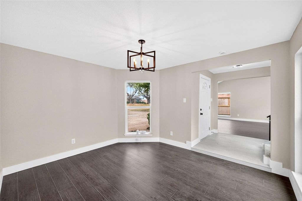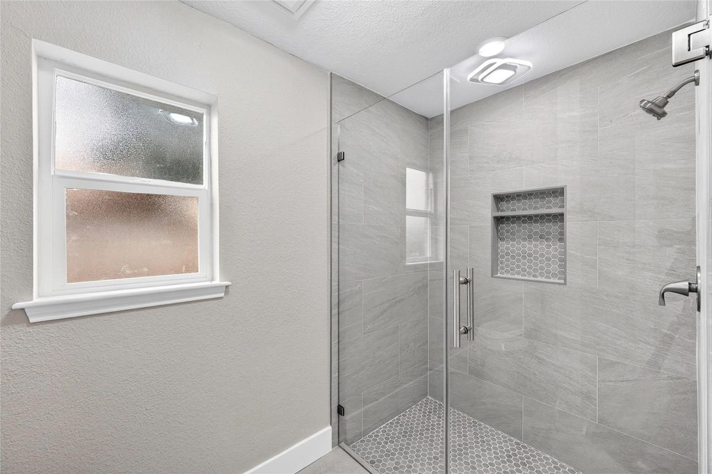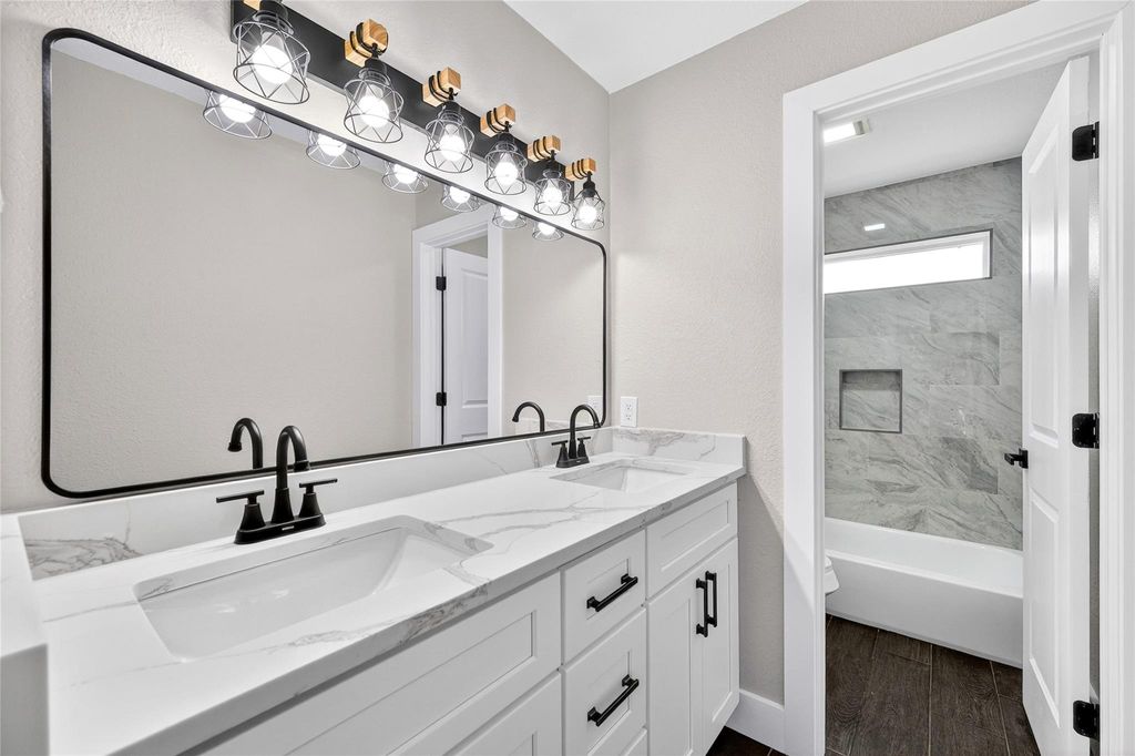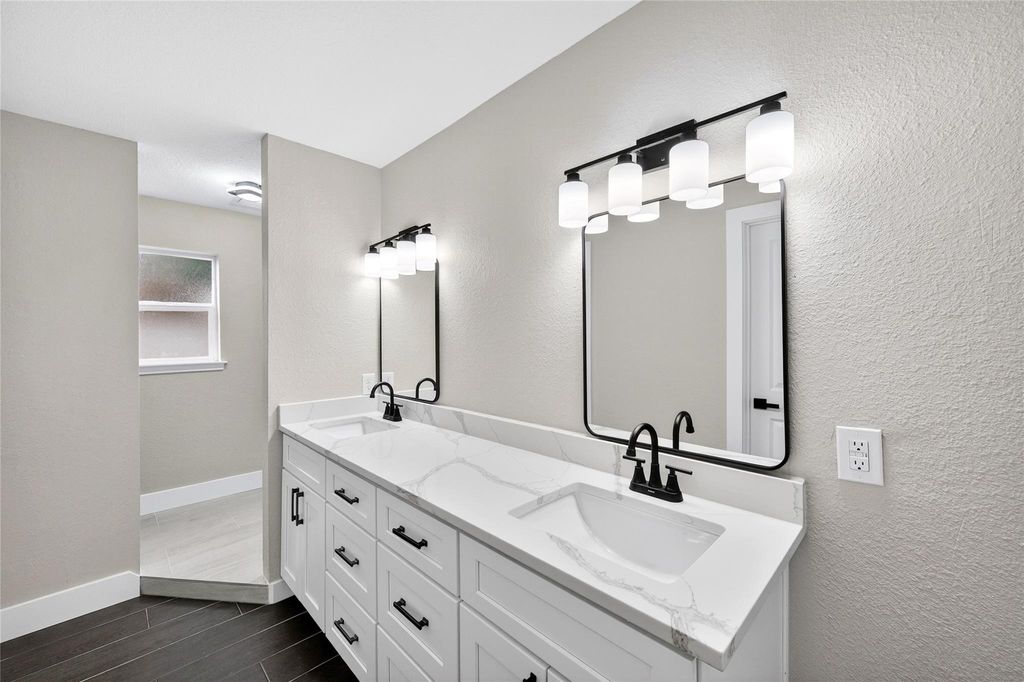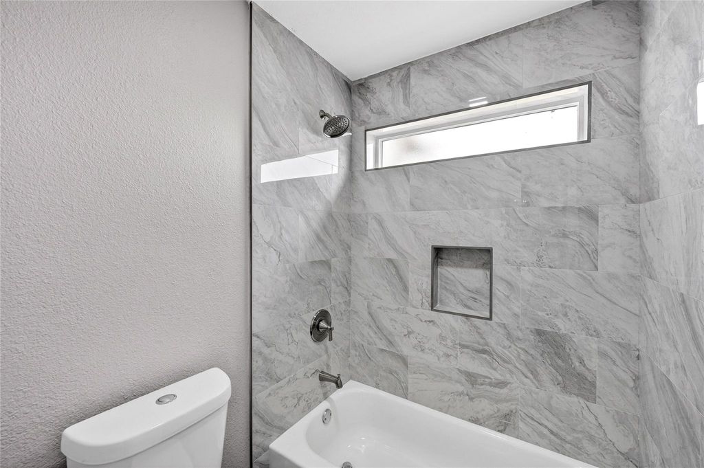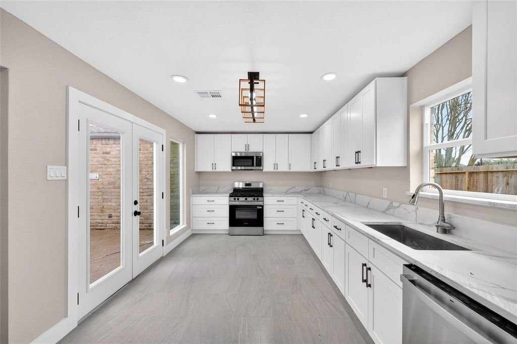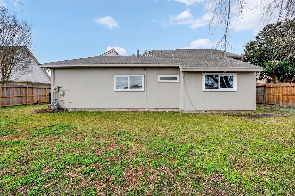 Recently updated 3-bedroom, 2-bath home offering 2,153 sq ft of thoughtfully designed living space on a 9,120 sq ft lot. Built on a slab foundation with brick veneer exterior, the home features vaulted and high ceilings, recessed lighting, ceiling fans, and expansive living areas filled with natural light. The central living room showcases an open-to-above ceiling and built-in wet bar, creating a defined entertaining space that flows seamlessly into the dining area and kitchen. The kitchen includes quartz countertops, gas range, and extensive cabinetry. The primary suite features a double quartz vanity, framed mirrors, matte black fixtures, and a glass-enclosed walk-in shower with tiled niche. Flooring throughout the main level and bedrooms is hard surface; the second-floor loft is carpeted, providing a flexible additional living area. A private interior patio anchors the center of the home.