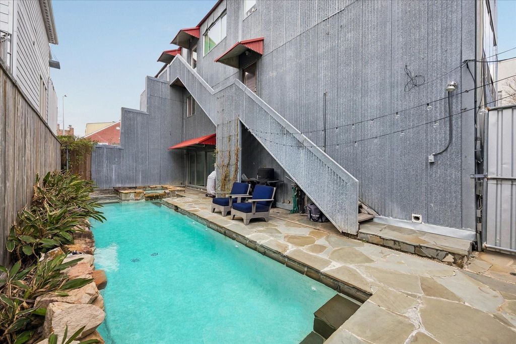 Rare opportunity in sought after Rice Military! Architecturally pleasing 2 bedroom 2 bath home with private pool. Front courtyard welcomes you to the home. 1st floor large bedroom with access to backyard with spacious closet, Saltillo tile, and bathroom with tub/shower! Pine hardwood floors lead you to the second floor. Great living room with soaring ceilings, tons of natural light and wall of windows. Chefs kitchen with breakfast bar, granite, subzero fridge, tiled floor, and plenty of storage. Open to dining room or additional living area! 3rd floor private primary with carpet, ensuite bathroom features granite and tub/shower! Rare private pool/spa with flagstone surround is perfect for entertaining, cooking out, or just having a relaxing day! Access to backyard from all 3 levels. 2 car attached garage with washer and dryer! Plenty of additional parking outside. Close to downtown! In between Memorial Park and Buffalo Bayou walking/biking trails! Close to parks! Great location!