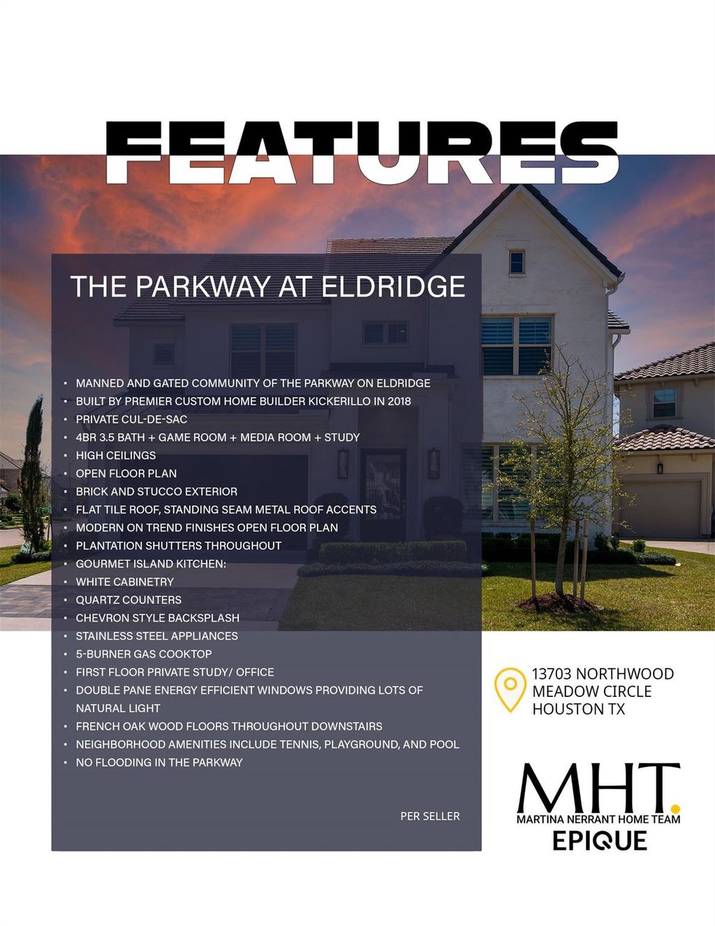 Welcome to refined modern living in the prestigious, manned-gated community of The Parkway at Eldridge. This thoughtfully designed residence blends timeless architecture with contemporary sophistication.Step inside to a sun-filled, open-concept layout where French oak hardwoods, soaring ceilings, and floor-to-ceiling windows create an atmosphere of elegance and light. The gourmet island kitchen serves as the heart of the home with its custom white cabinetry, quartz countertops, chevron-pattern backsplash, "”seamlessly flowing into the spacious living area for effortless entertaining.With 4 BR 3.5 baths, this home includes a first-floor primary suite, private study, and expansive upstairs game and media rooms.Perfectly situated in Houston's Energy Corridor, the home is convenient to top-rated public and international schools. Residents of The Parkway enjoy exclusive amenities including tennis courts, playground,resort-style community pool"”never flooded per sellers