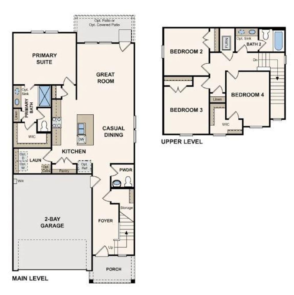 The open-concept design of the two-story Lexington floor plan shows the huge island kitchen connected to the great room and dining room. The open-feel of the home is popular with today's sophisticated buyer, who is looking for a design that fosters togetherness in the home and makes entertaining fun. The use of space in the Lexington is well thought out, with the primary suite privately situated on the first floor, while the secondary bedrooms are on the second floor.