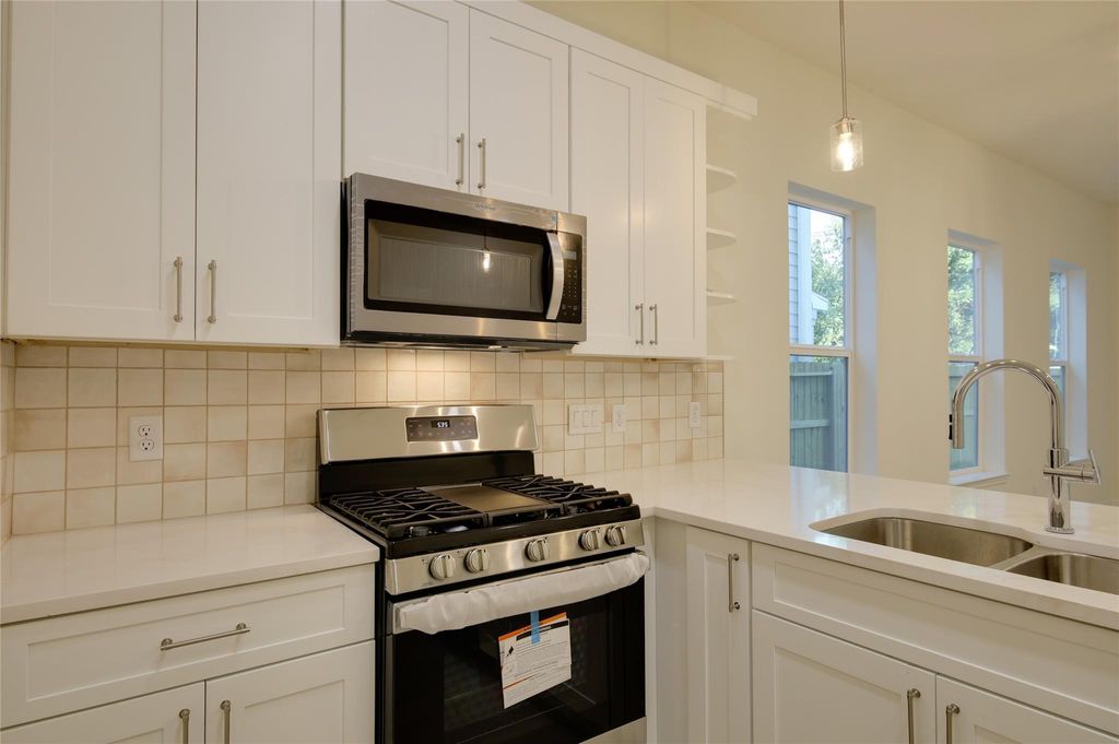 Spacious modern home with sleek design and thoughtful finishes, ideal for seamless indoor-outdoor living. The open kitchen is a highlight, featuring bright quartz countertops, stainless steel appliances, ample and custom cabinet space, a pantry room, storage, and a breakfast bar that seamlessly flows into the inviting living area. Upstairs, the primary suite boasts 9-foot ceilings, as on the first floor, a spa-like bathroom with a soaking tub and sleek glass shower, a walk-in closet, and an abundance of natural light. Enjoy summer evenings on the covered back patio with a ceiling fan, or stroll through the landscaped side yard and stone-paved pathway. Clean lines and designer touches, and luxury vinyl flooring throughout. Excellent construction quality and design. Energy-efficient home. No-HOA and 2.09% tax rate! Great city location! Move-in ready. Schedule your private showing today!