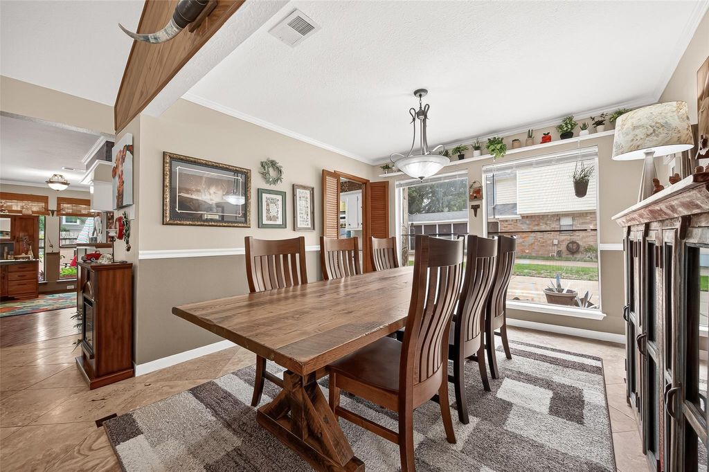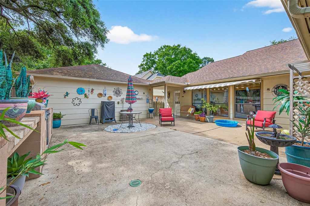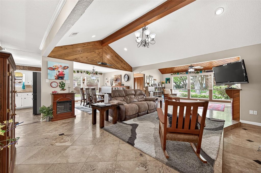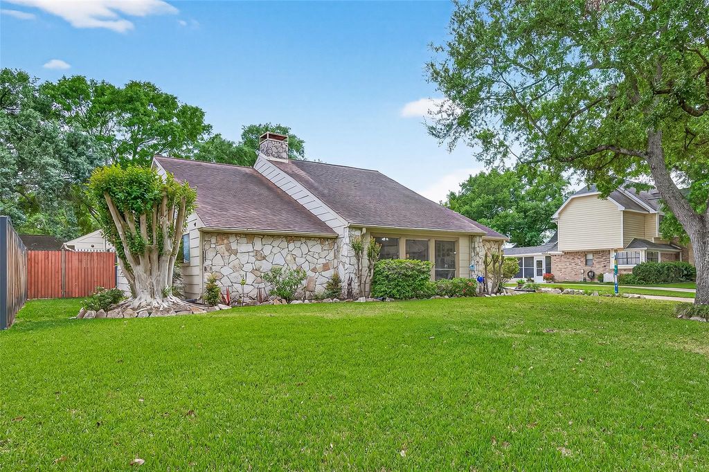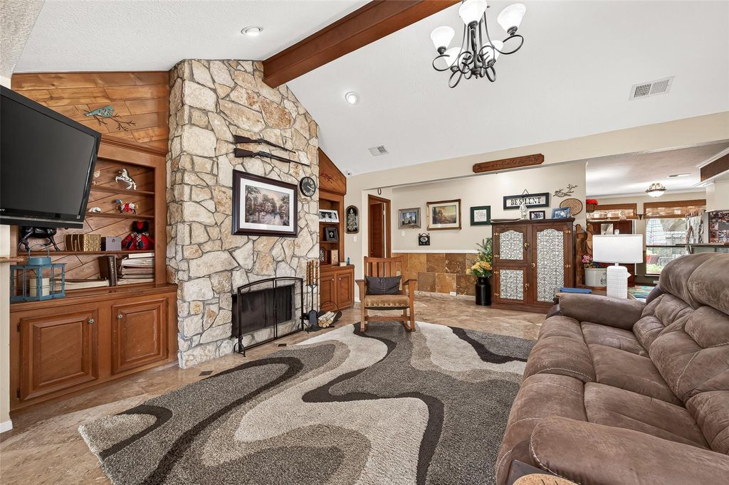 Welcome to this charming single story home with 4 bedrooms on a culdesac street. Some recent updates include: pex plumbing, light fixtures, AC & electrical panel. Inside, you'll find no carpet & stunning stonework that adds warmth & elegance to the home. The spacious living room features a floor-to-ceiling stone fireplace, rich wooden built-ins & a striking beamed ceiling. The cozy sitting room showcases a beautiful wood-accented ceiling w/dry bar. The kitchen is bright and inviting with gleaming white cabinets, stainless steel appliances and easy access to the formal dining room. The primary suite offers an ensuite bath with dual sinks, dedicated vanity area and a large walk-in shower. 3 additional bedrooms provide versatility for guests, home office or hobbies. Step outside to enjoy a fully fenced backyard designed for entertaining, complete with a patio area, turf area, and an outdoor kitchen with a built-in grill. Neighborhood includes 24/7 security for peace of mind.