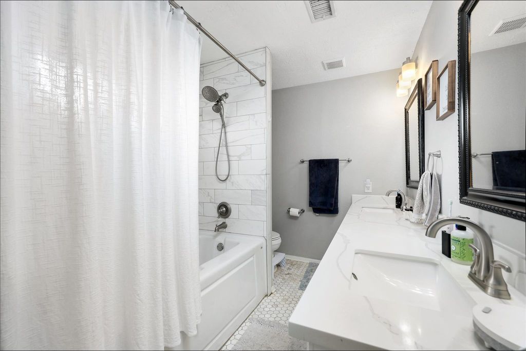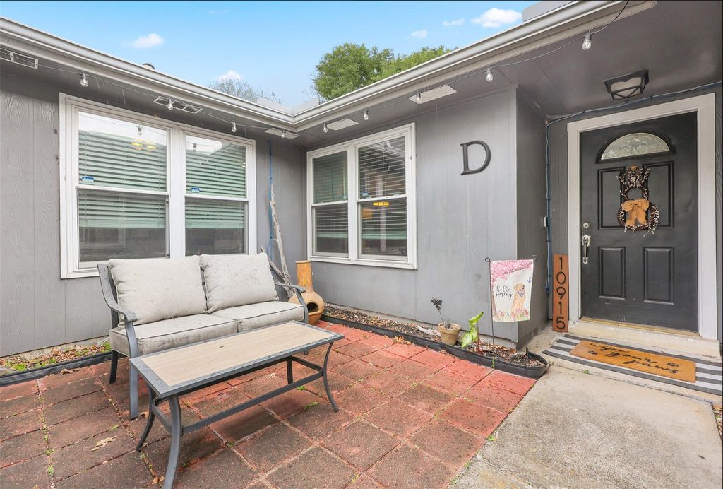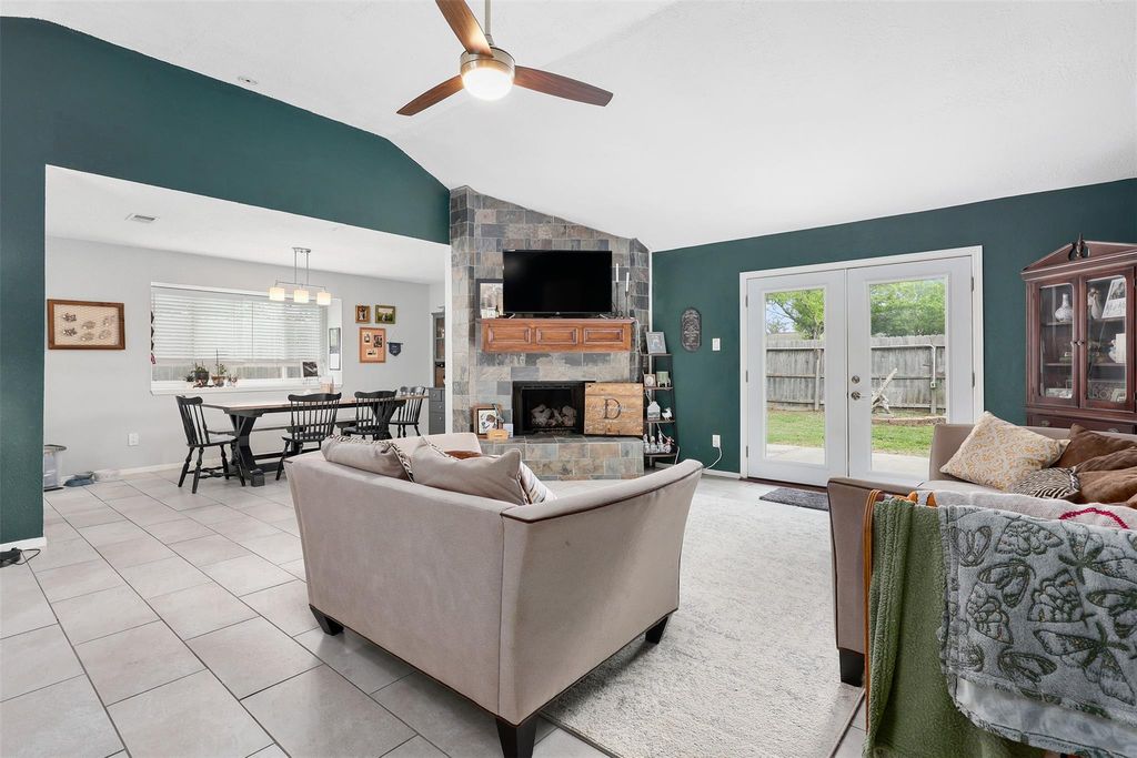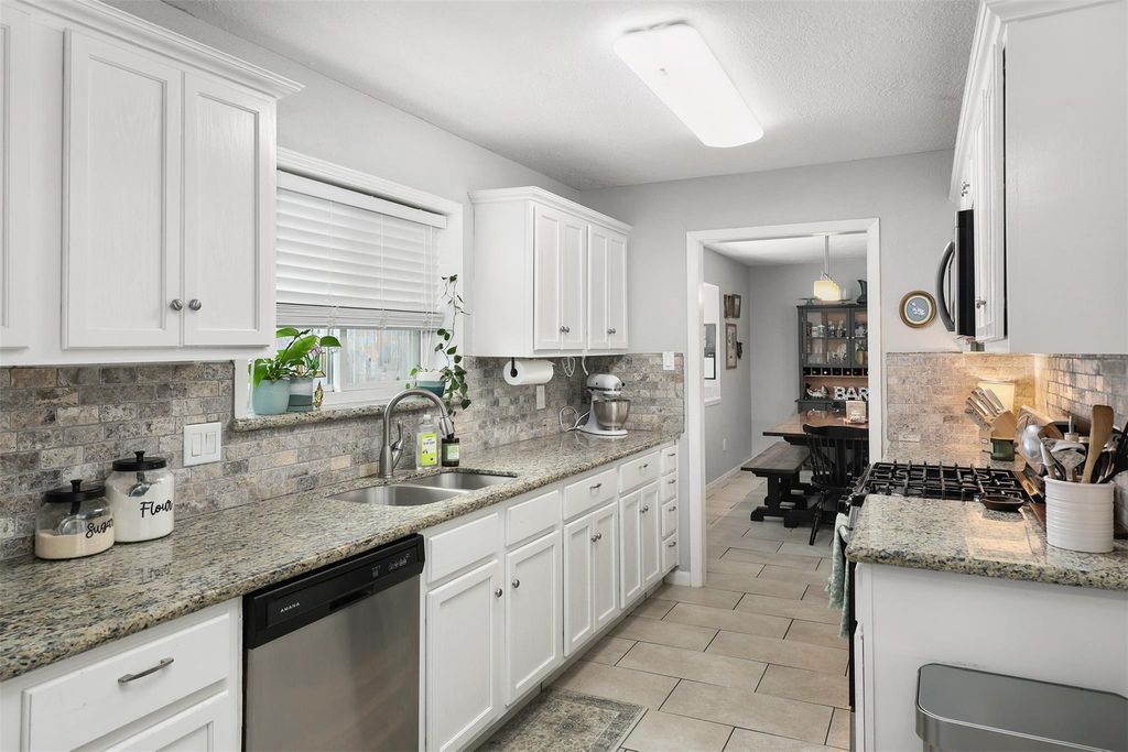 This charming home boasts numerous updates throughout. The kitchen showcases white cabinetry, granite countertops, tile backsplash, and stainless steel appliances. Both bathrooms have been remodeled with marble countertops, tall toilets, and beautiful tile. The primary bathroom features a walk-in closet with custom built-in cabinetry. Recent upgrades include windows, pex piping, water heater (9/25), and roof (3/26). The spacious living area offers high ceilings, french doors, and gas log fireplace with a wood mantle. Easy entertaining with formal dining open to living room. Additional features include 2" blinds, ceiling fans, updated fixtures, and washer, dryer and refrigerator included.