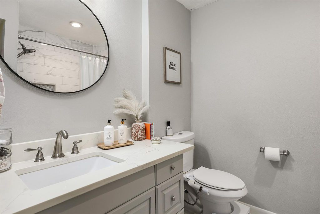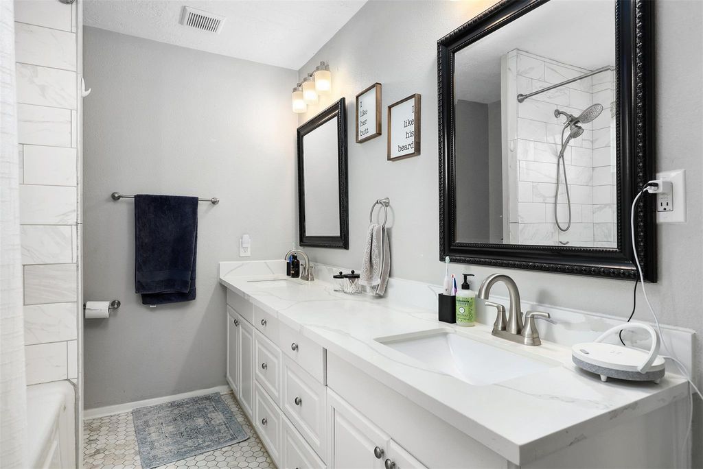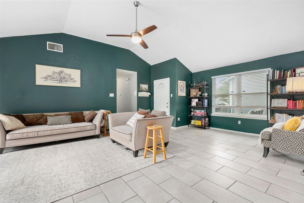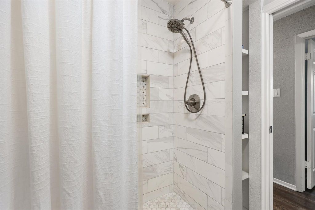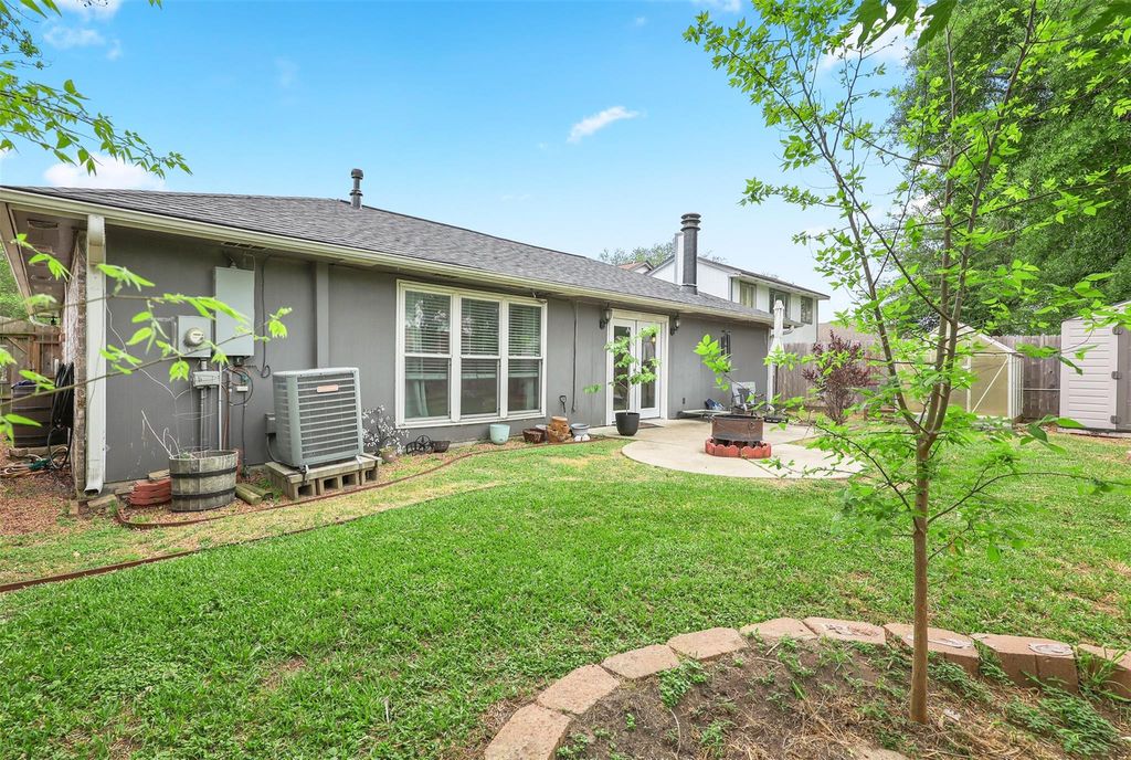 This charming home boasts numerous updates throughout. The kitchen showcases white cabinetry, granite countertops, tile backsplash, and stainless steel appliances. Both bathrooms have been remodeled with marble countertops, tall toilets, and beautiful tile. The primary bathroom features a walk-in closet with custom built-in cabinetry. Recent upgrades include windows, pex piping, water heater (9/25), and roof (3/26). The spacious living area offers high ceilings, french doors, and gas log fireplace with a wood mantle. Easy entertaining with formal dining open to living room. Additional features include 2" blinds, ceiling fans, updated fixtures, and washer, dryer and refrigerator included.